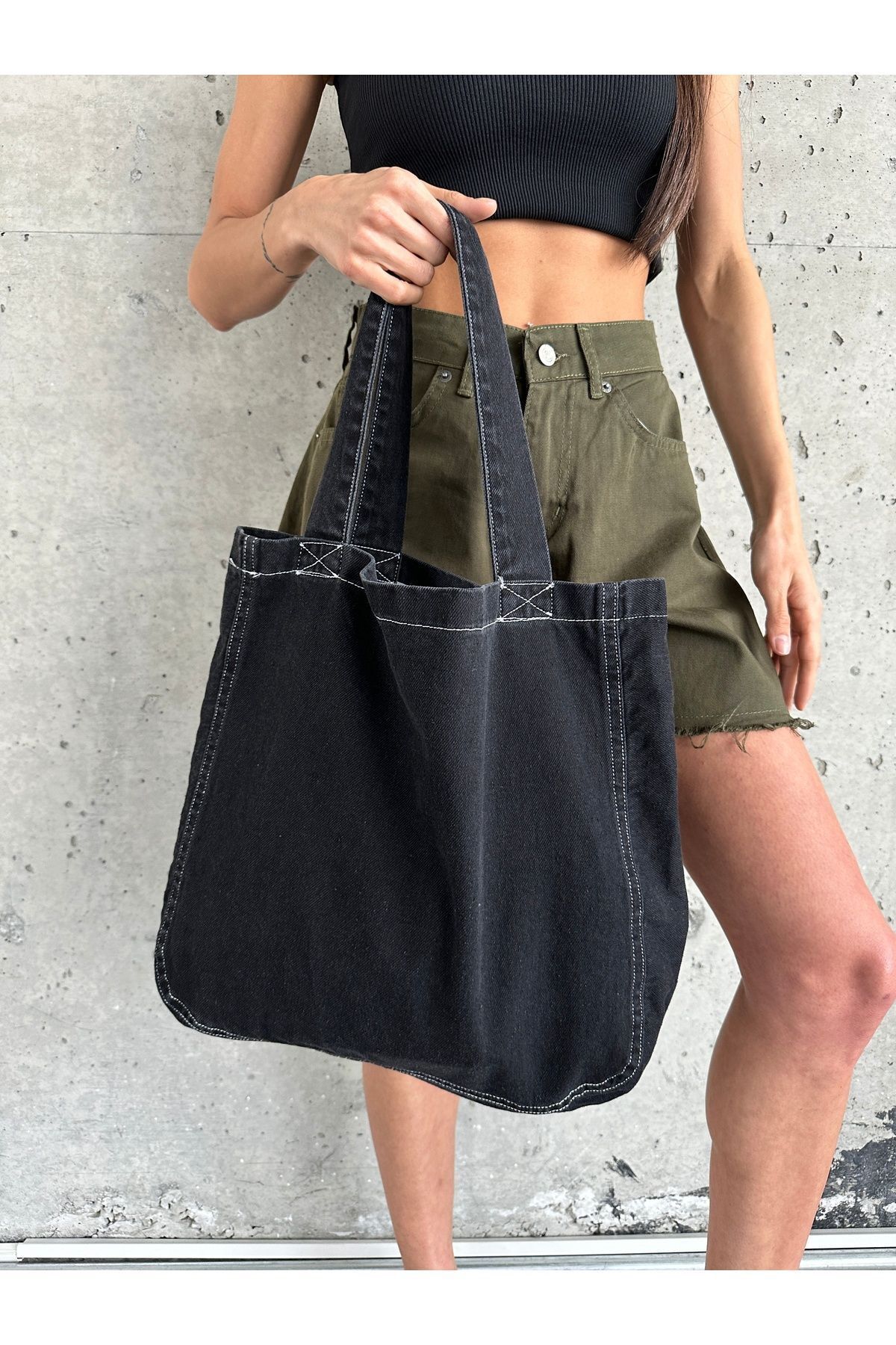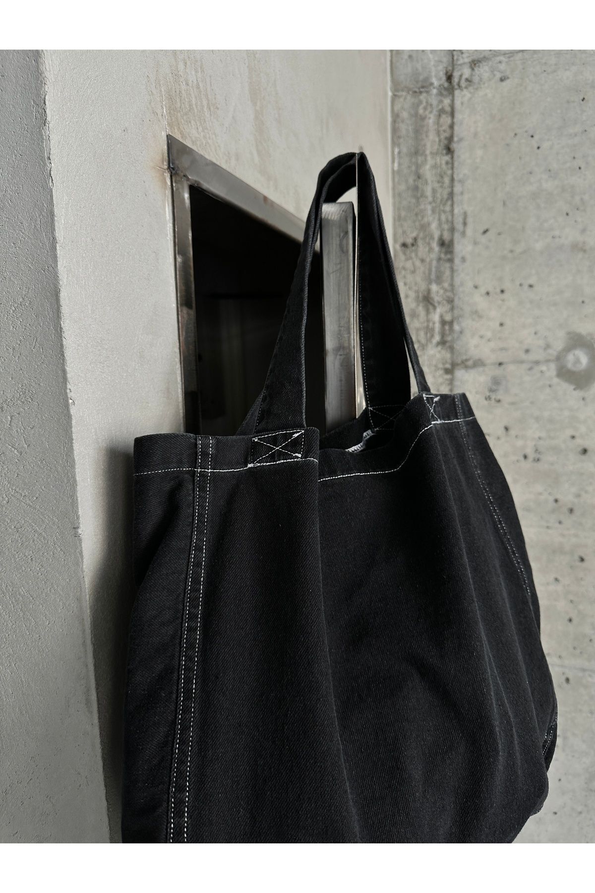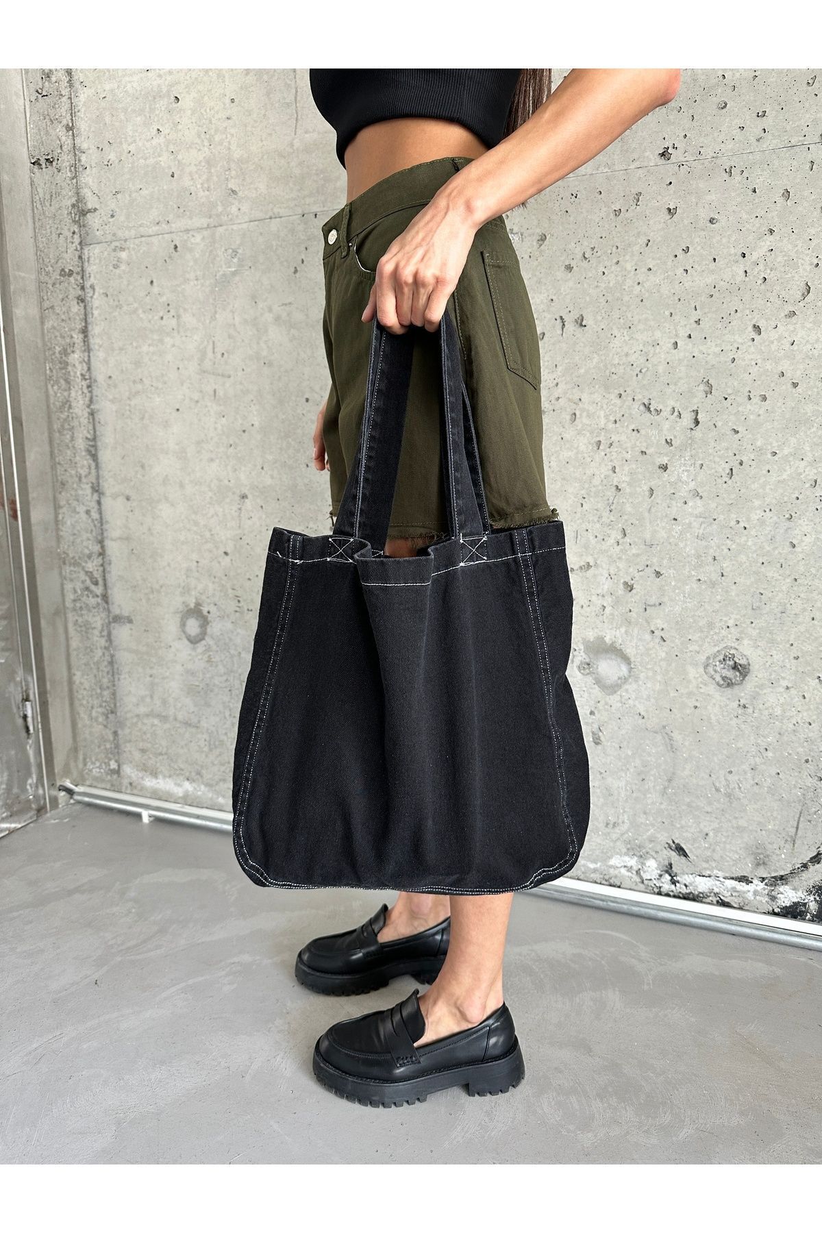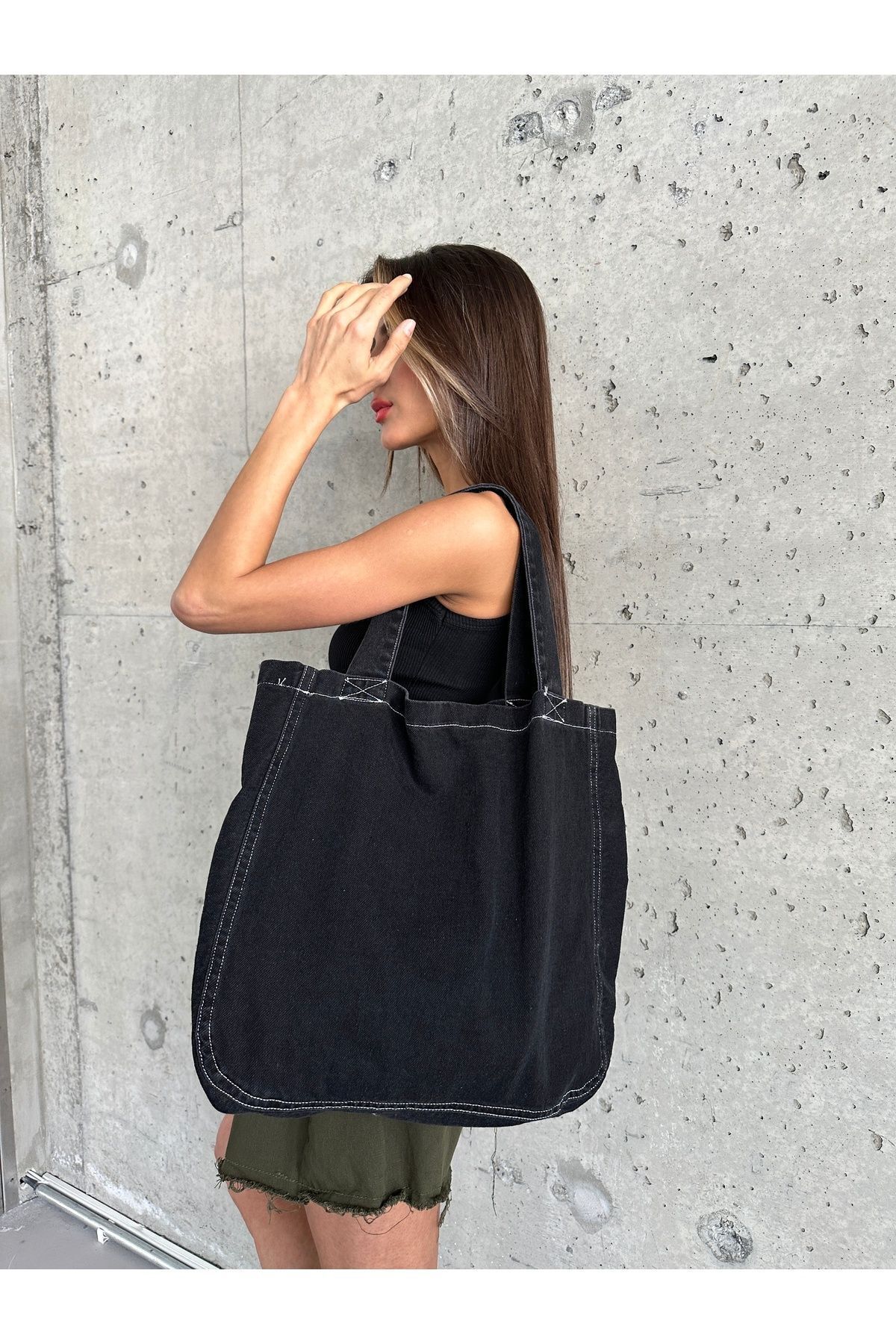 Askılı Beyaz Dikişli Siyah Kot Çanta Siyah - Standart