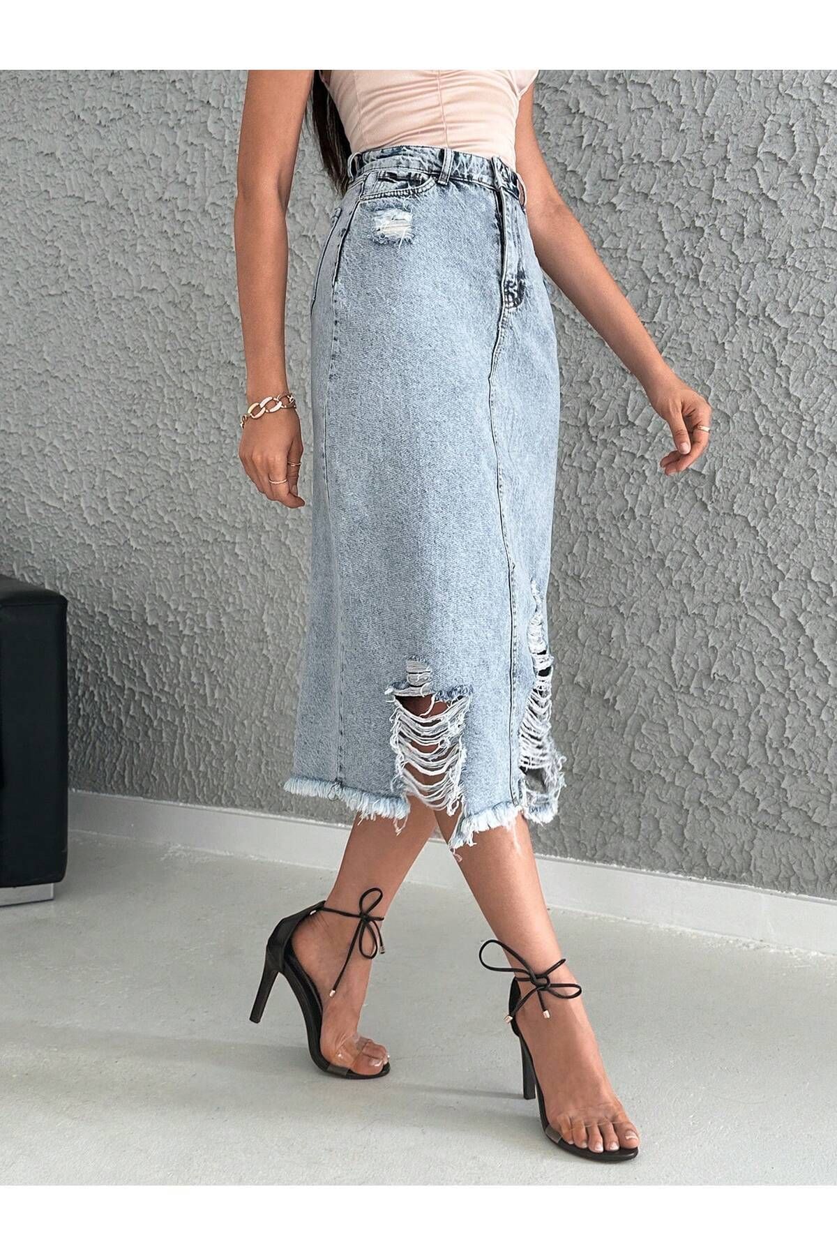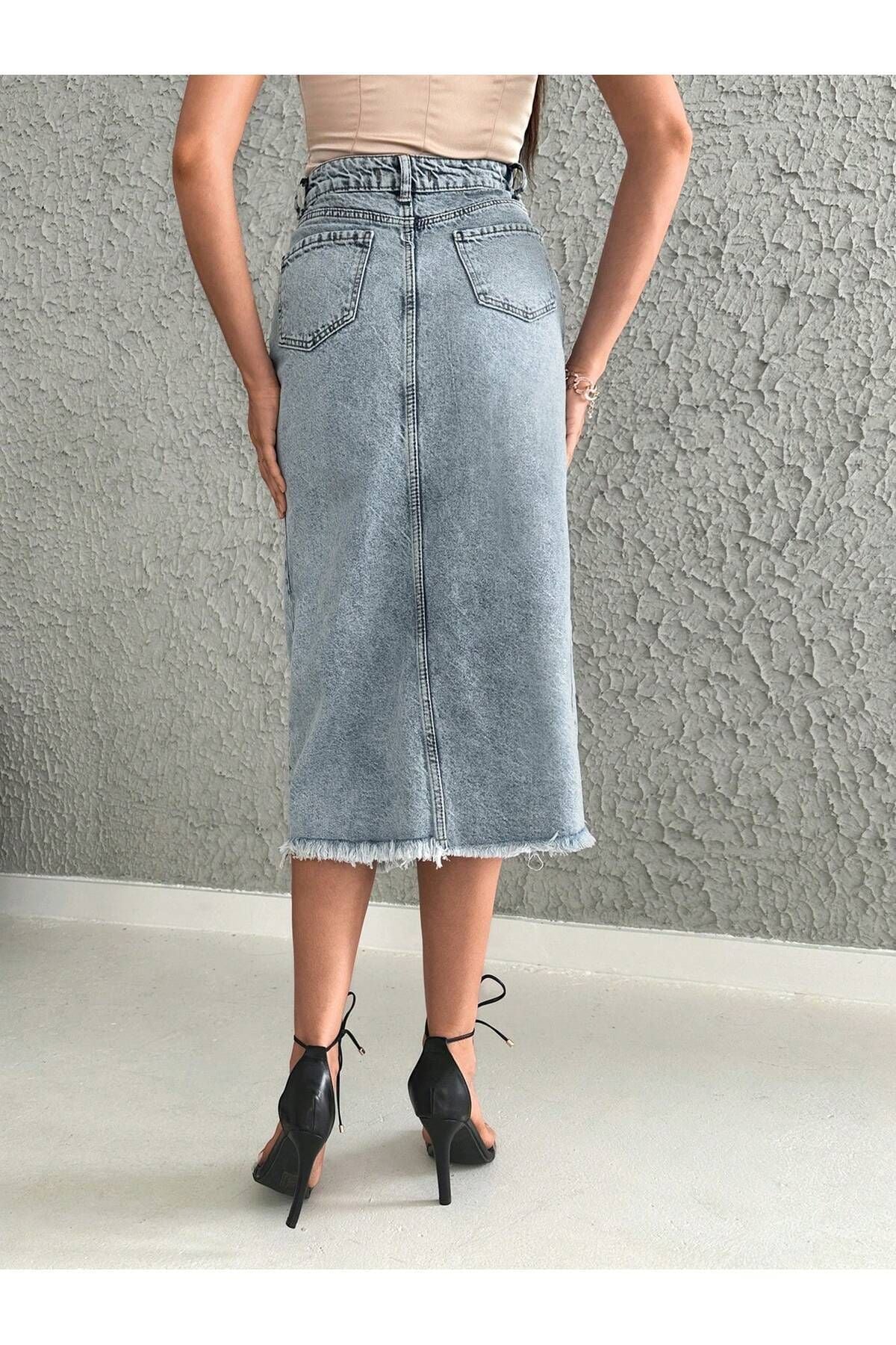 Kadın Açık Kar Yıkama Lazer Püsküllü Likrasız Kot Etek MAVİ - M