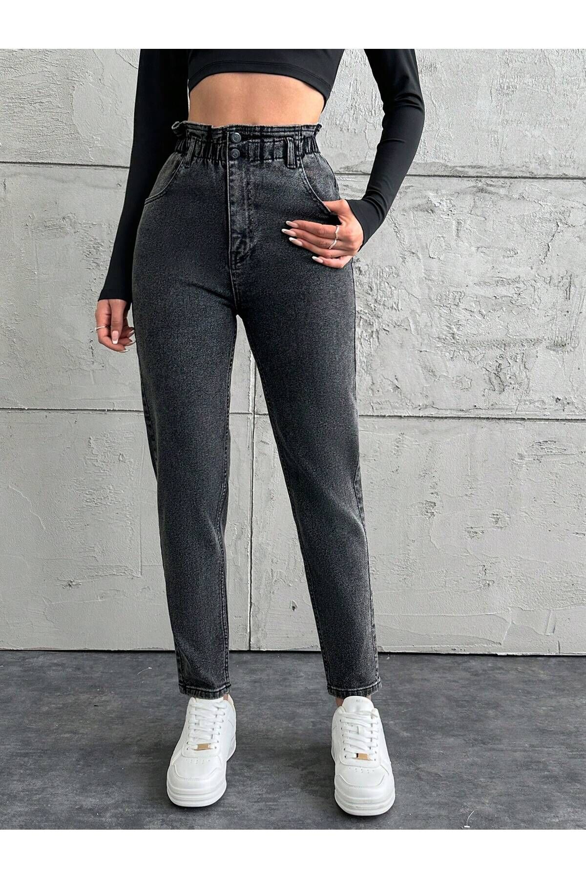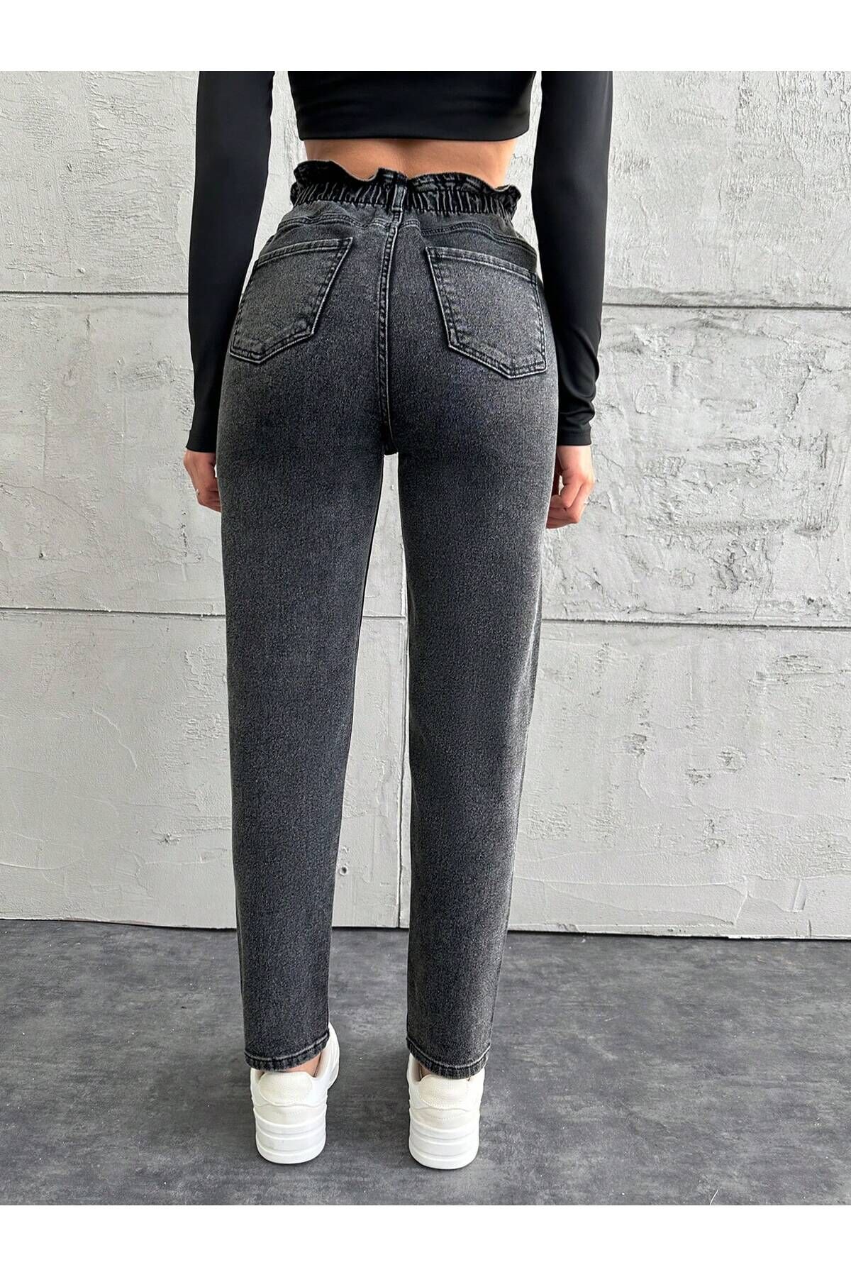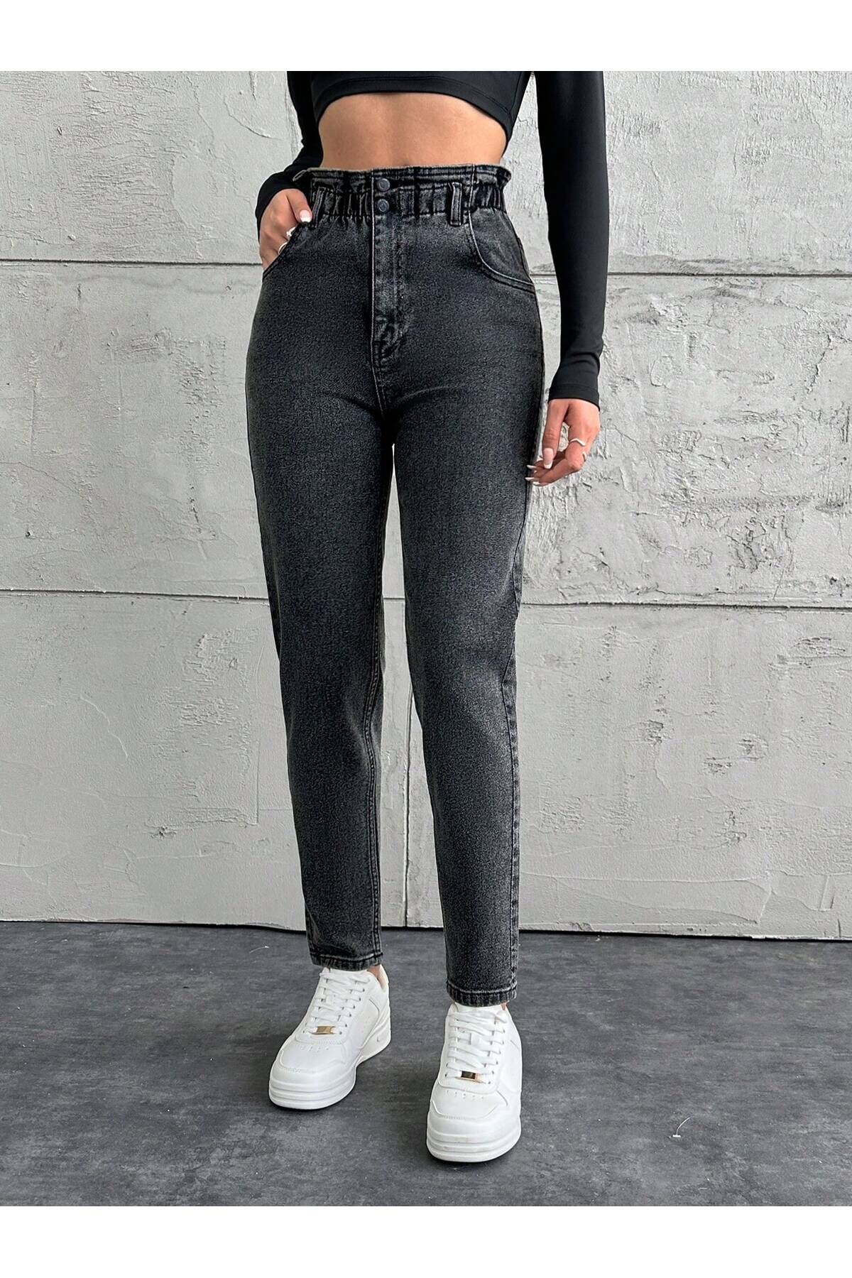 Kadın Bel Lastikli Siyah Kar Yıkama Mom Kalıp Likralı Jean GRİ - 29