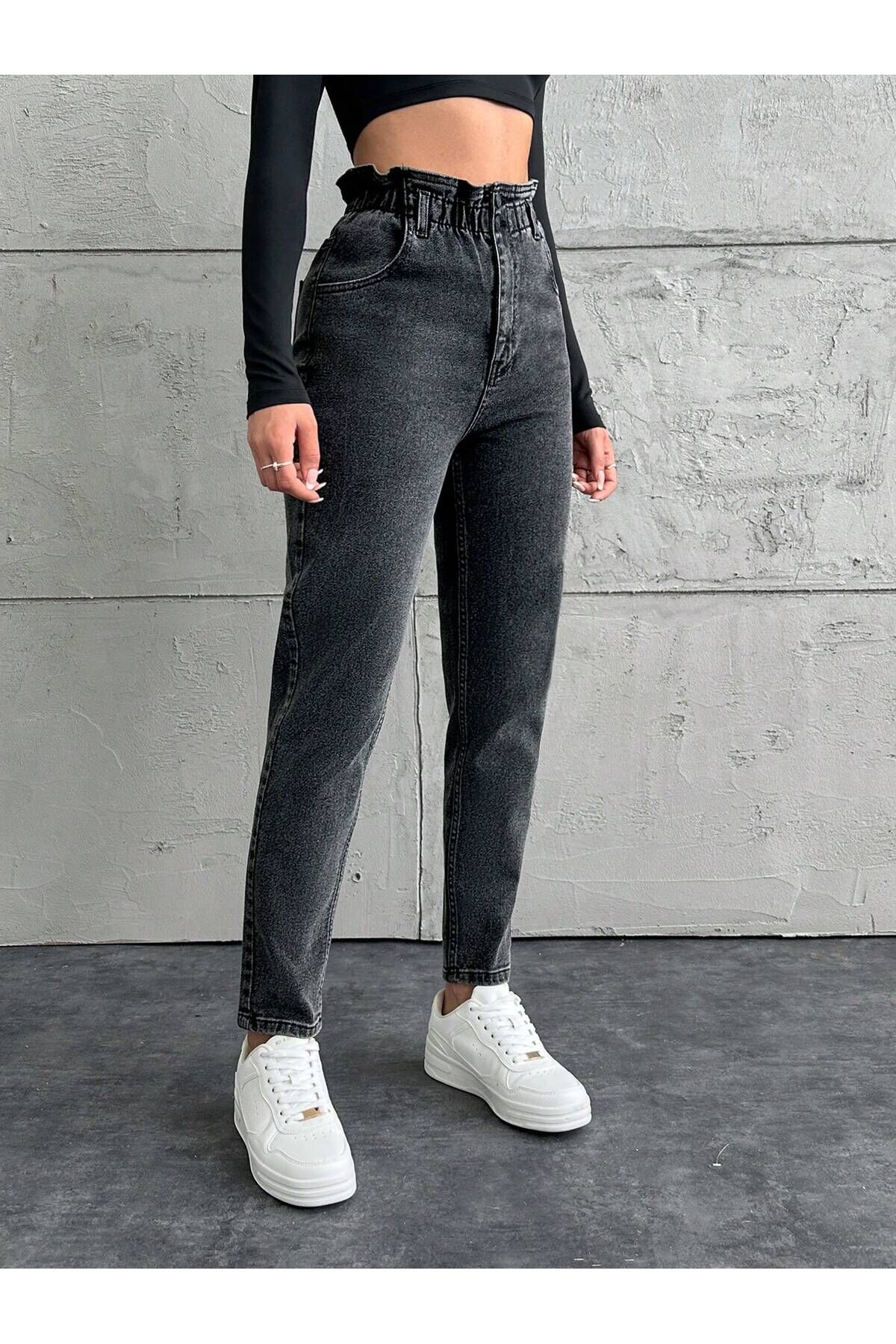Kadın Bel Lastikli Siyah Kar Yıkama Mom Kalıp Likralı Jean GRİ - 31