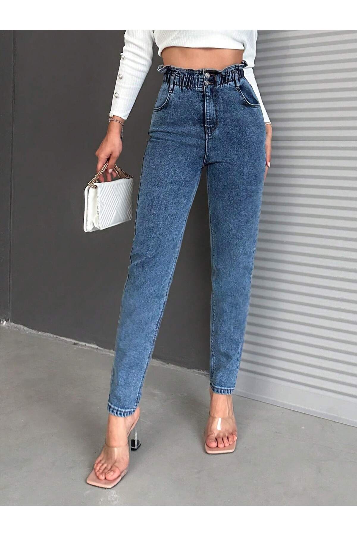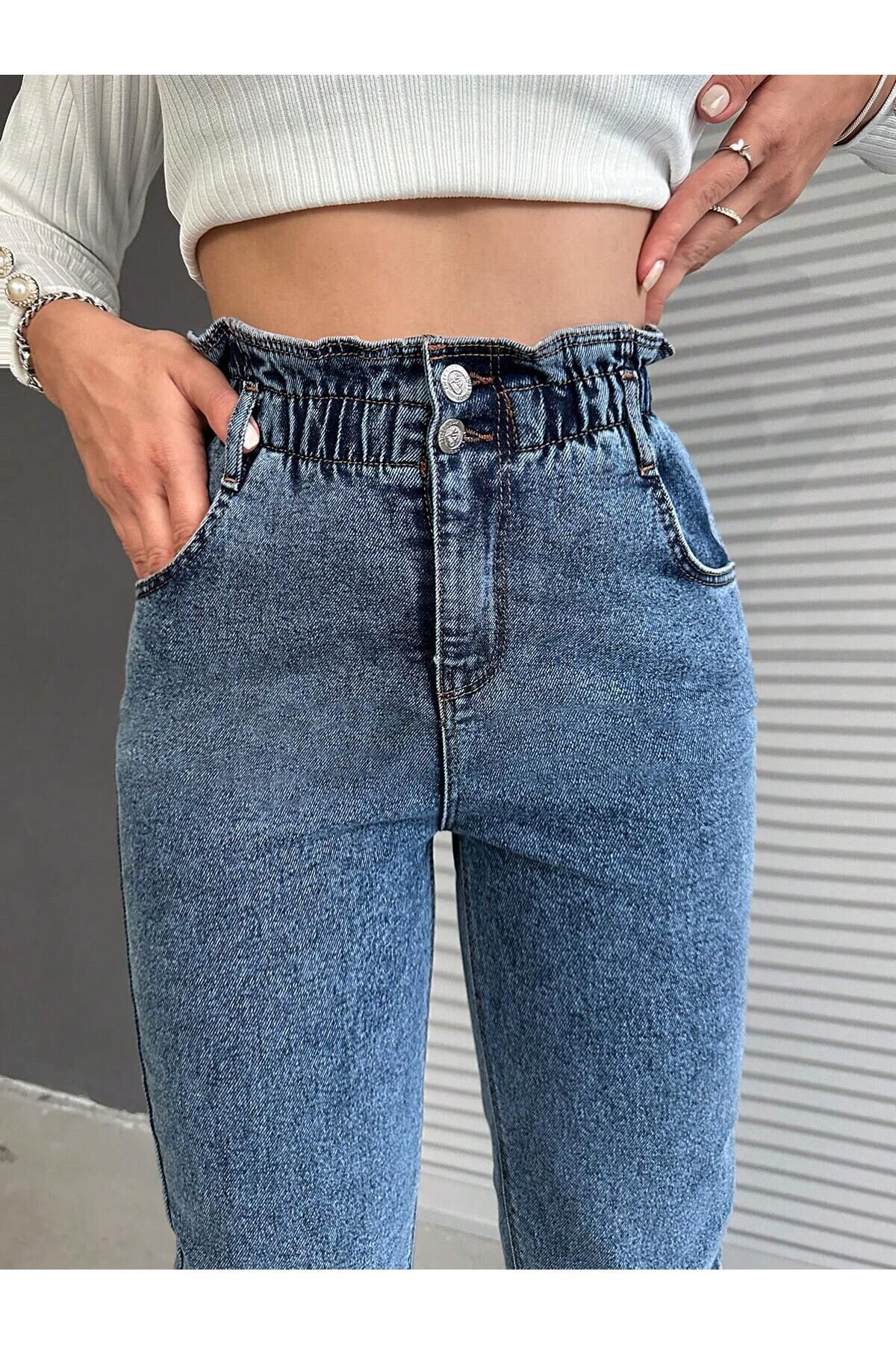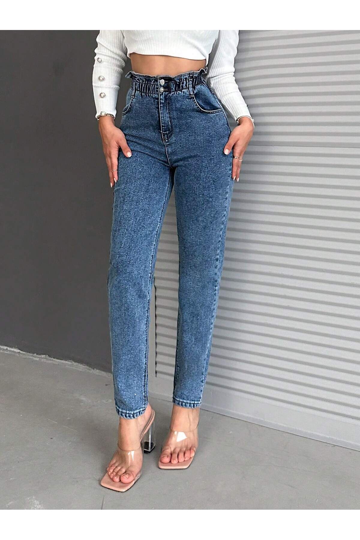 Kadın Bel Lastikli Siyah Kar Yıkama Mom Kalıp Likralı Jean KOYU MAVİ - 30