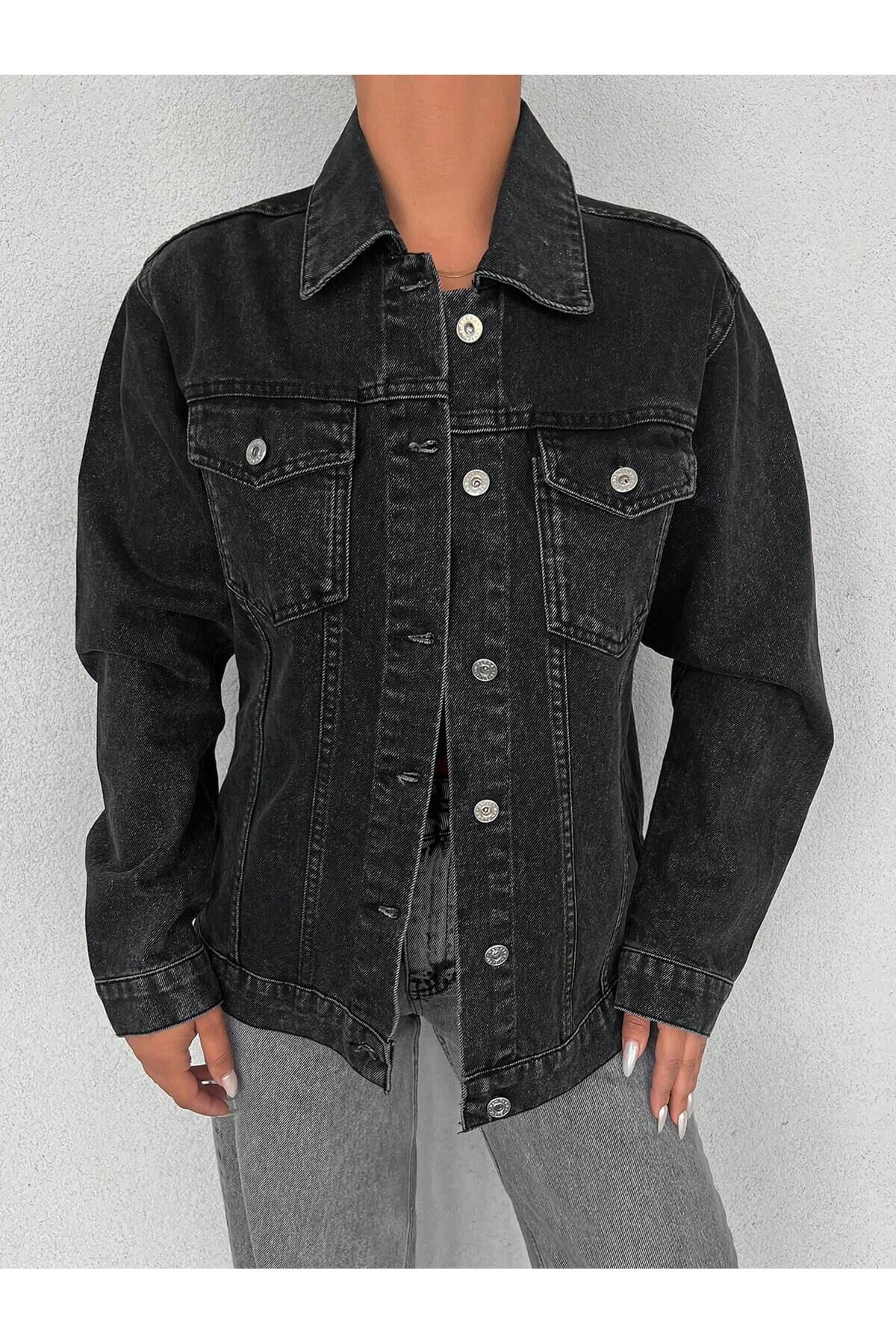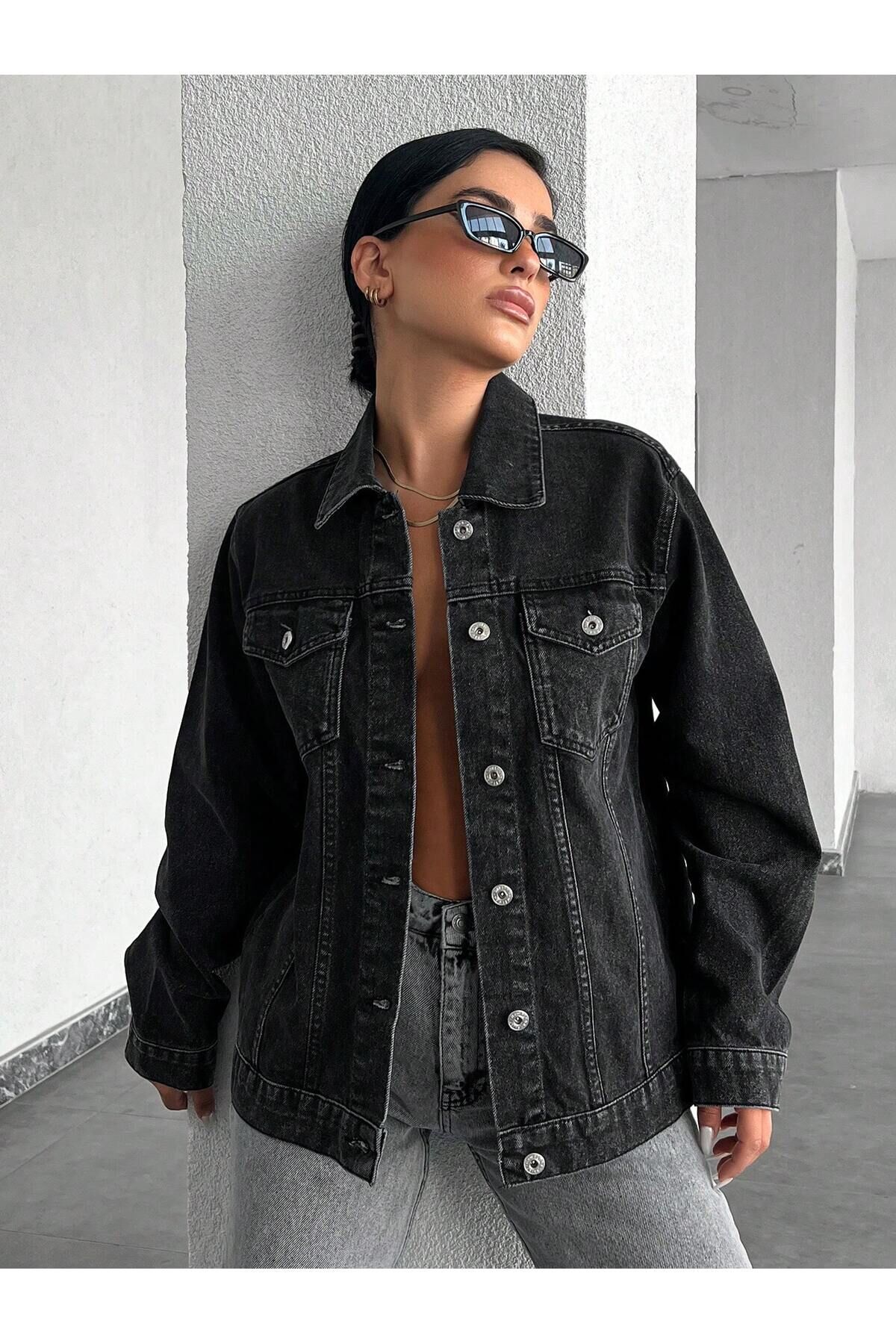 Kadın Beli Kuşaklı Mavi Kar Yıkama Oversize Kot Ceket Antrasit - L