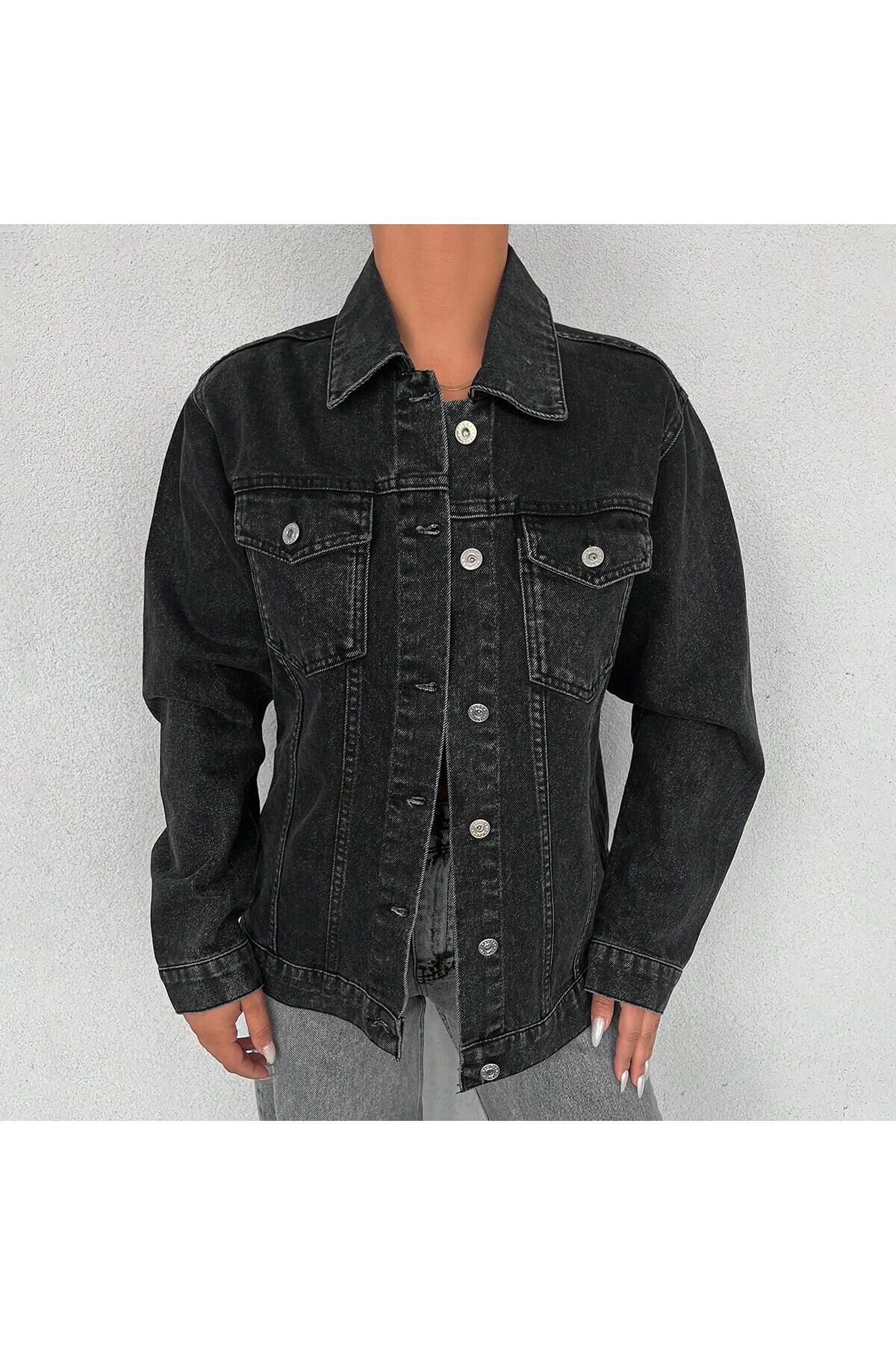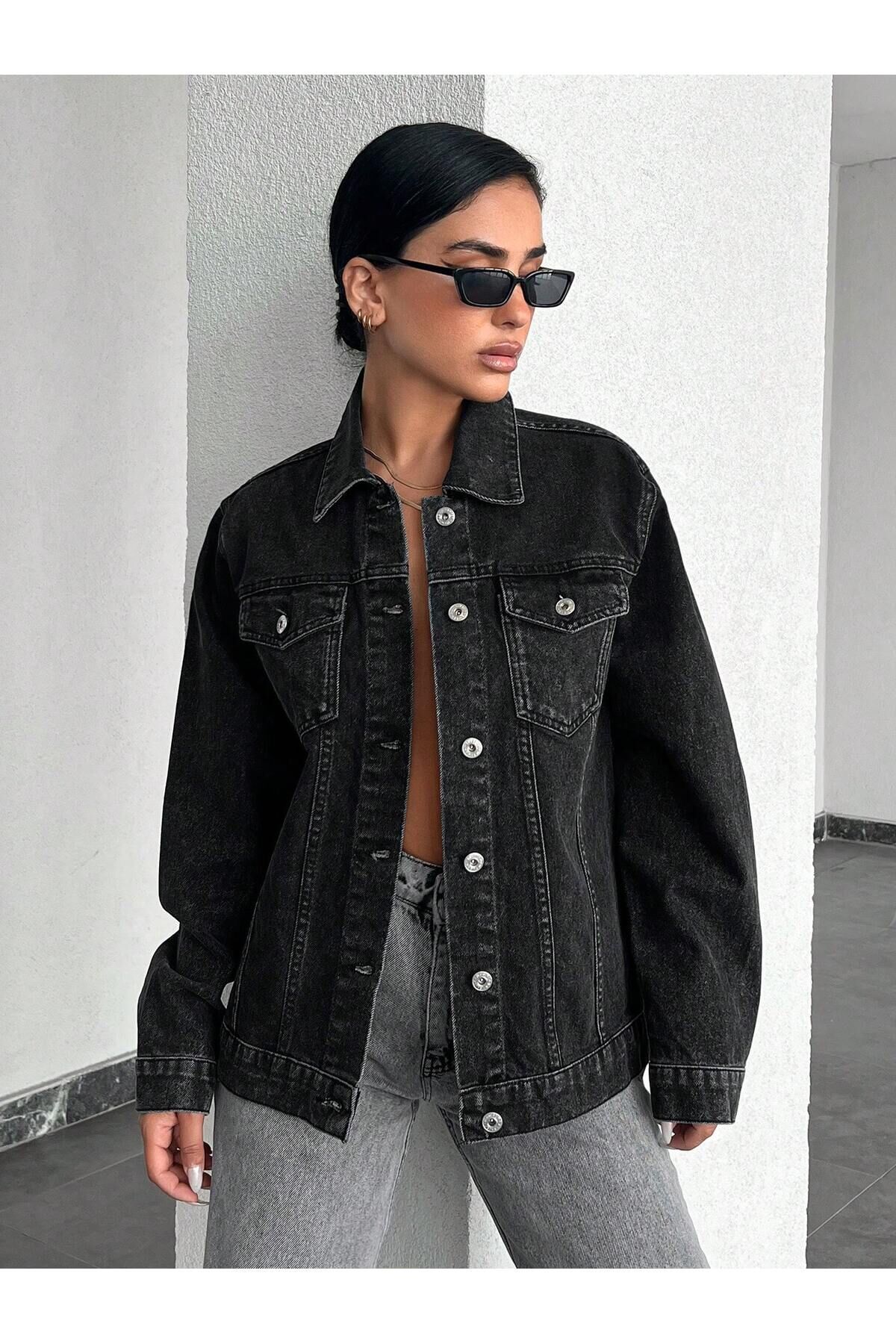 Kadın Beli Kuşaklı Mavi Kar Yıkama Oversize Kot Ceket Antrasit - S
