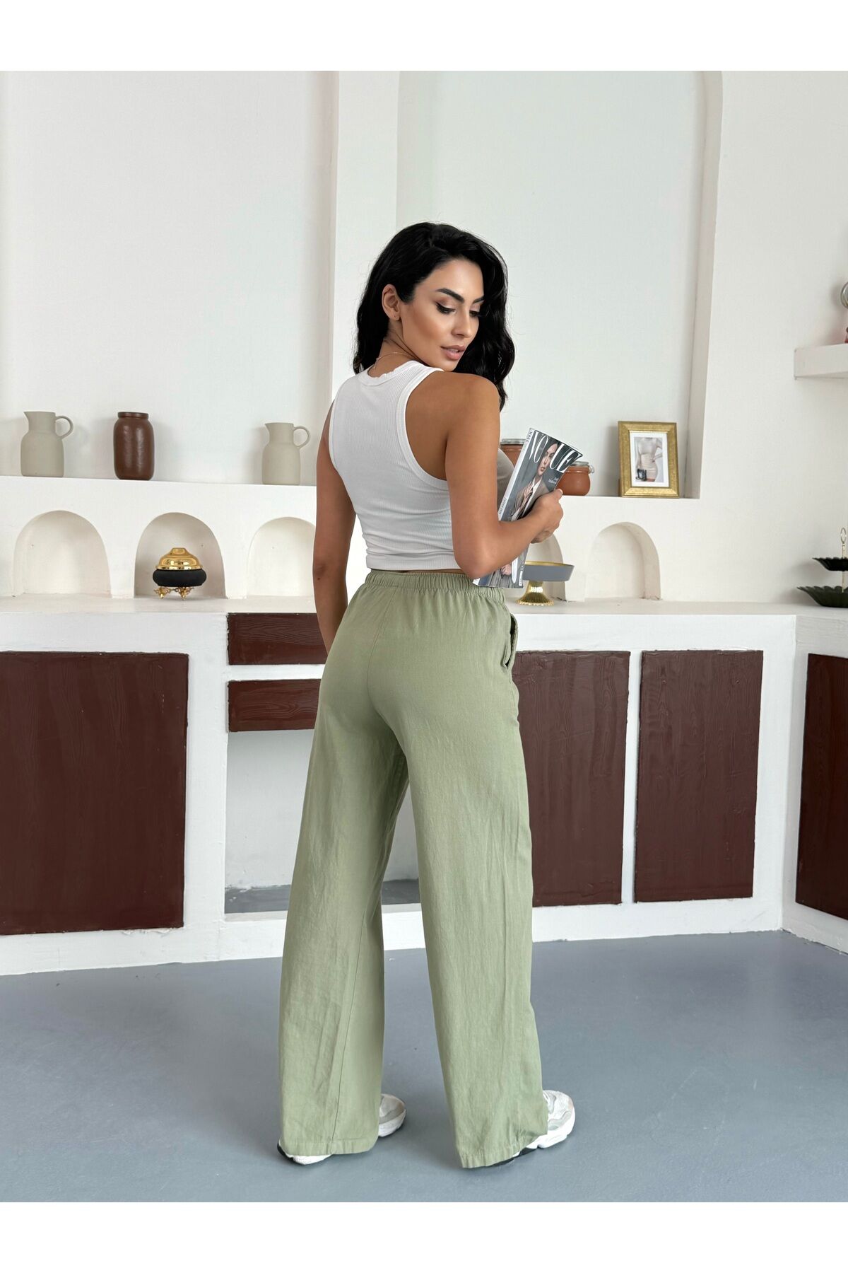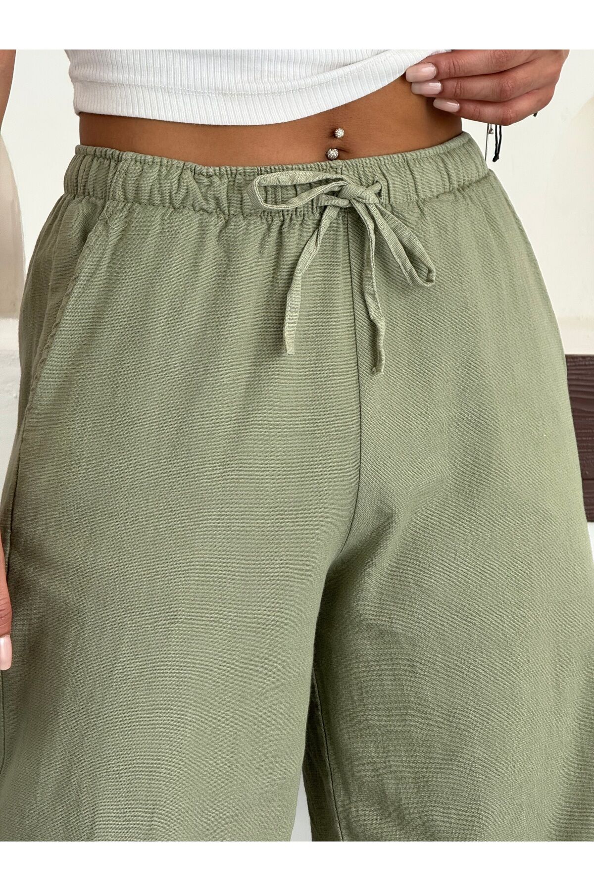 Kadın Keten Karışımlı Beli Lastik Bağlamalı Yüksek Bel Geniş Paça Cepli Yazlık Pantolon Haki - L