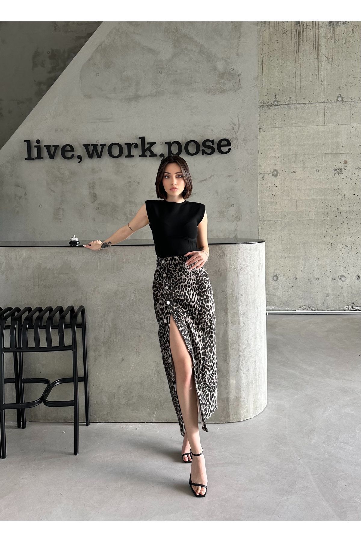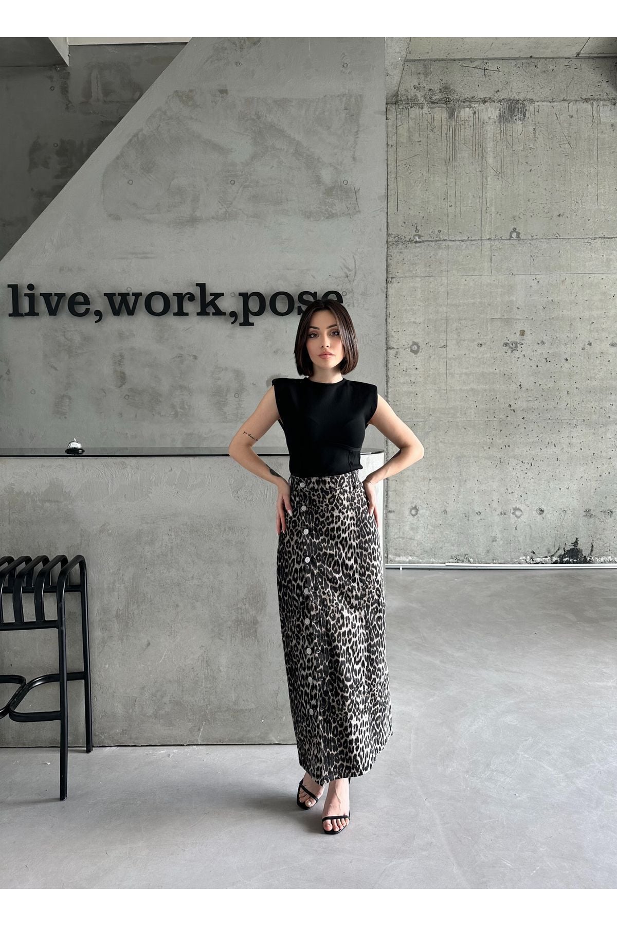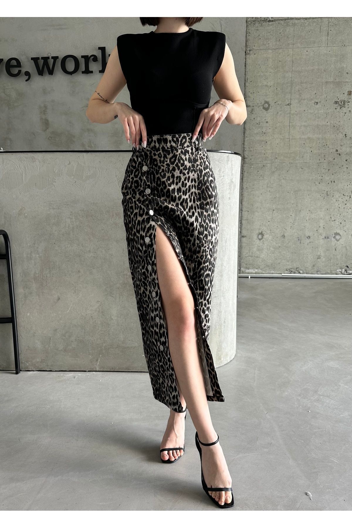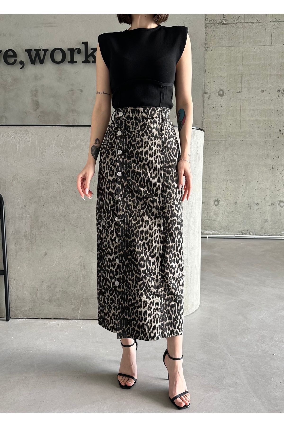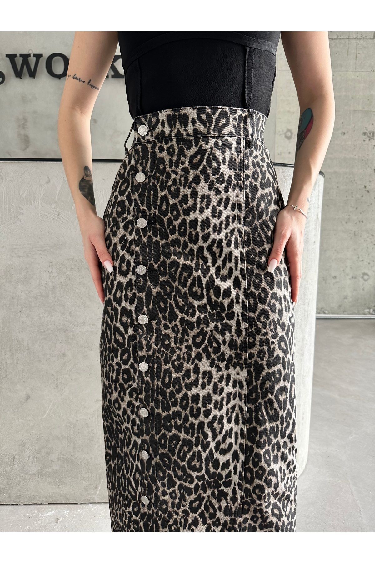 Kadın Önü Düğmeli Maxi Boy Leopar Desenli Likralı Denim Etek Siyah Leopar - M