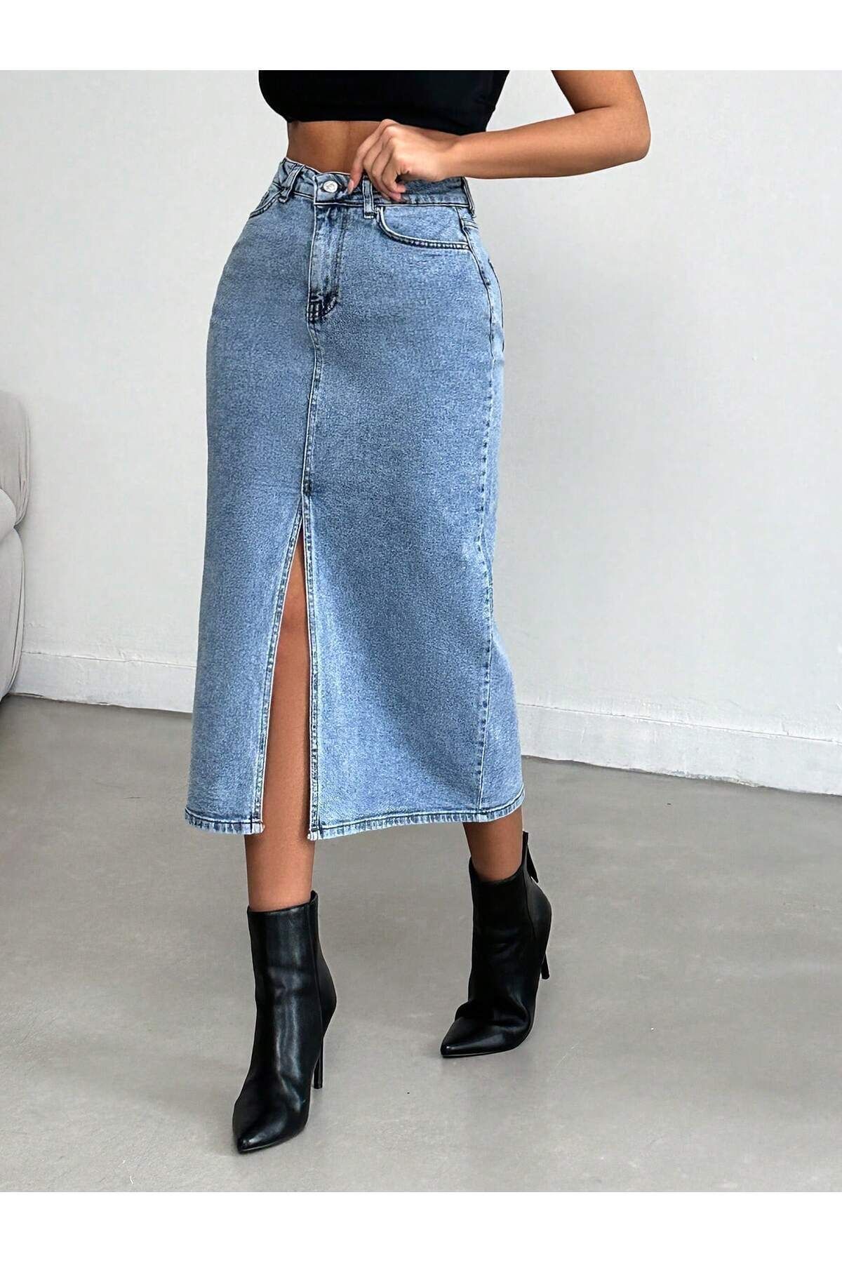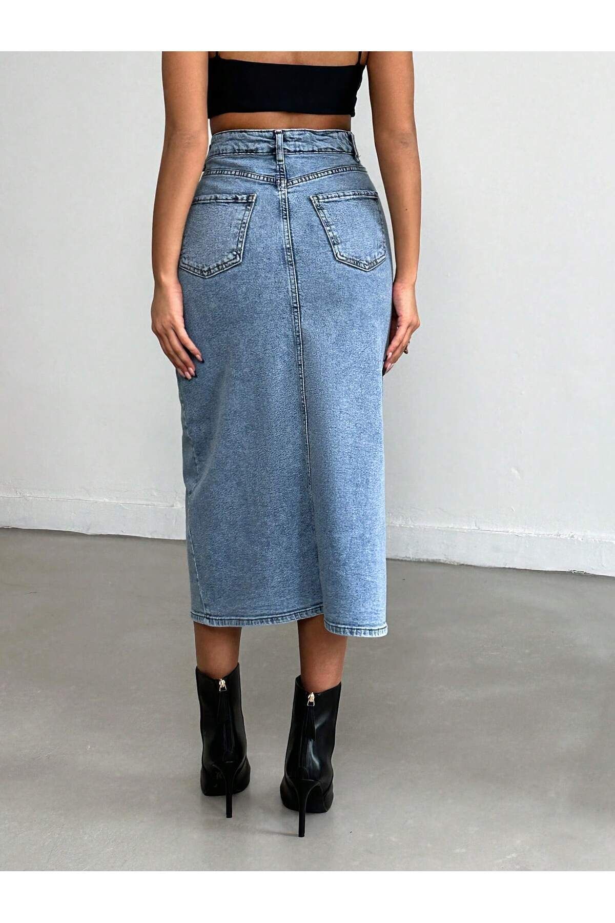 Kadın Yırtmaçlı Siyah Haki Renk Leopar Desen Likralı Kot Etek BUZ MAVİ - L