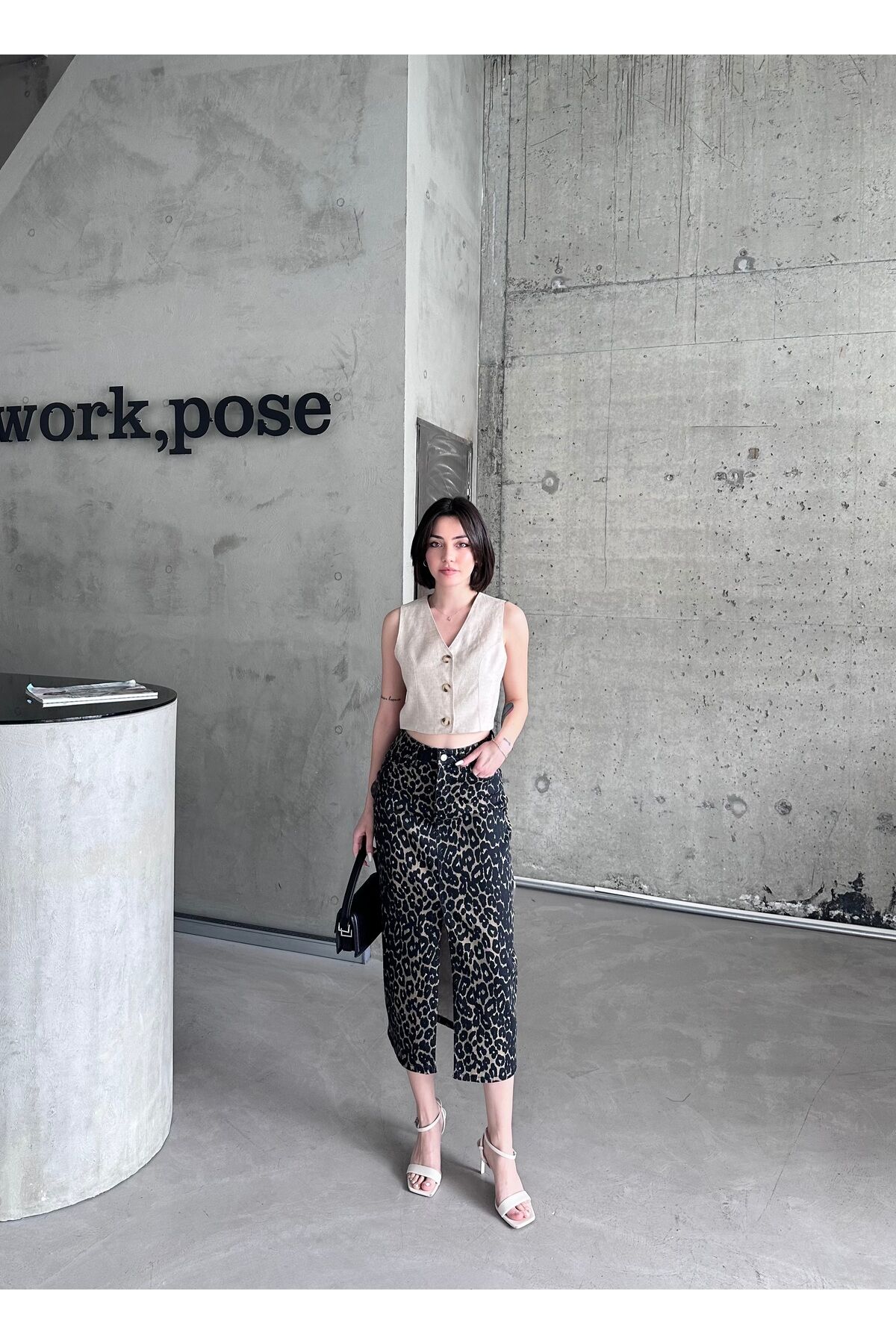 .Her yaştan kadının rahatlıkla tercih edebileceği genç kesim tasarımıyla dikkat çeken bu etek, düz renk leopar deseniyle şıklığı ve modernliği bir arada sunar.; Orta kalınlığındaki denim kumaşı, mevsim geçişlerinde ideal bir seçenek olup, slim fit kalıbıyla vücuda mükemmel oturur.; Yırtmaç detayları ile modern ve dinamik bir görünüm kazandıran bu etek, hareket özgürlüğünü artırırken aynı zamanda feminen çizgileri ön plana çıkarır.; Çift cepli tasarımı sayesinde hem fonksiyonel hem de stil sahibi bir kullanım sunar; küçük eşyalarınızı yanınızda taşımanız için pratik bir çözüm sağlar.; İç göstermeyen astar özelliği ile konforlu bir kullanım sunarken, likra karışımından üretilen materyali esnekliği arttırarak rahat hareket etme olanağı tanır.; Her ortamda kolayca uyum sağlayabilen bu etek, gençlerin enerjik ruhunu yansıtan dinamik tarzıyla dikkat çekici bir alternatif olarak gardrobunuzdaki yerini almayı bekliyor.;