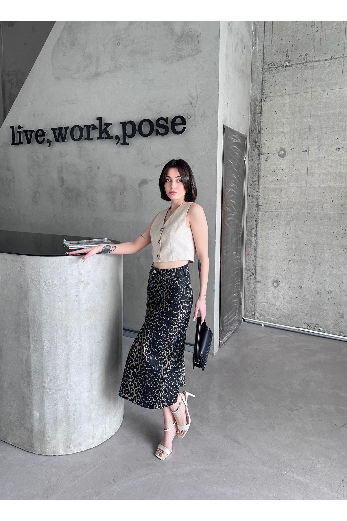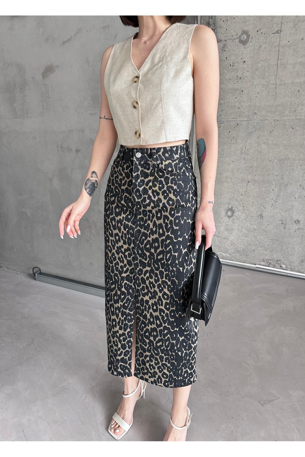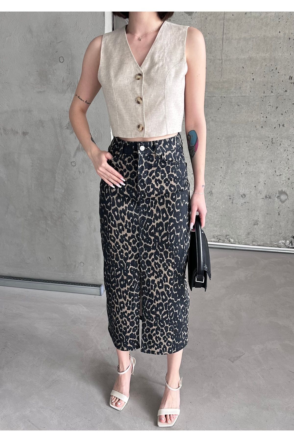 Kadın Yırtmaçlı Siyah Haki Renk Leopar Desen Likralı Kot Etek Yeşil - L