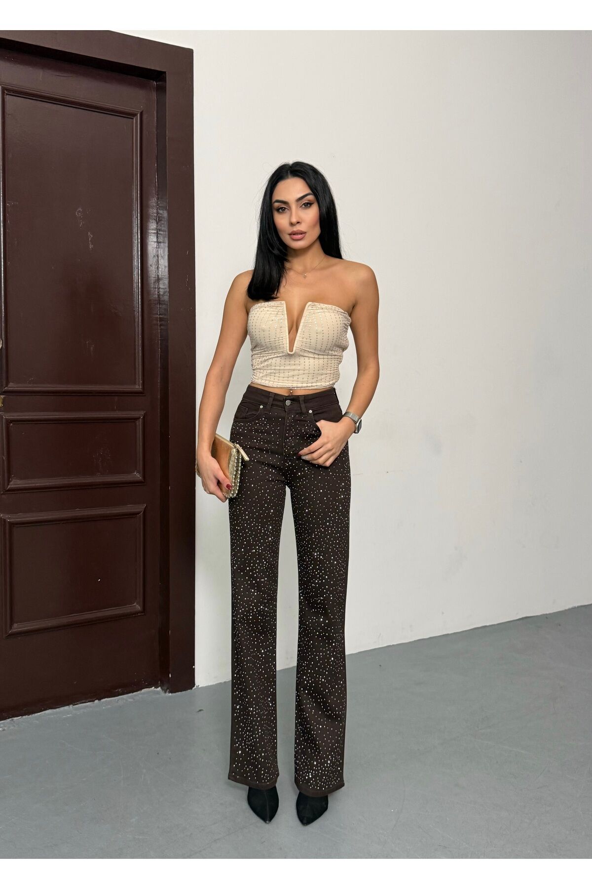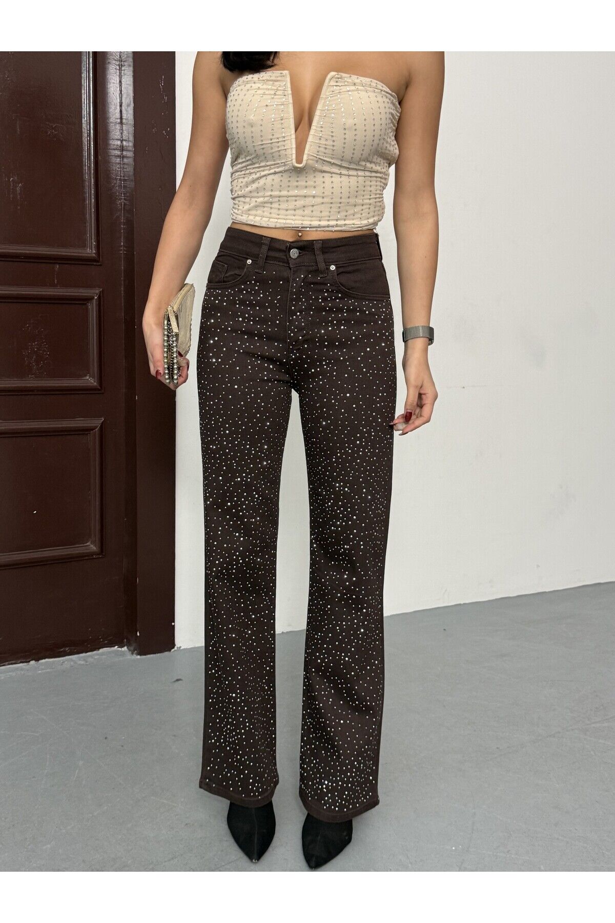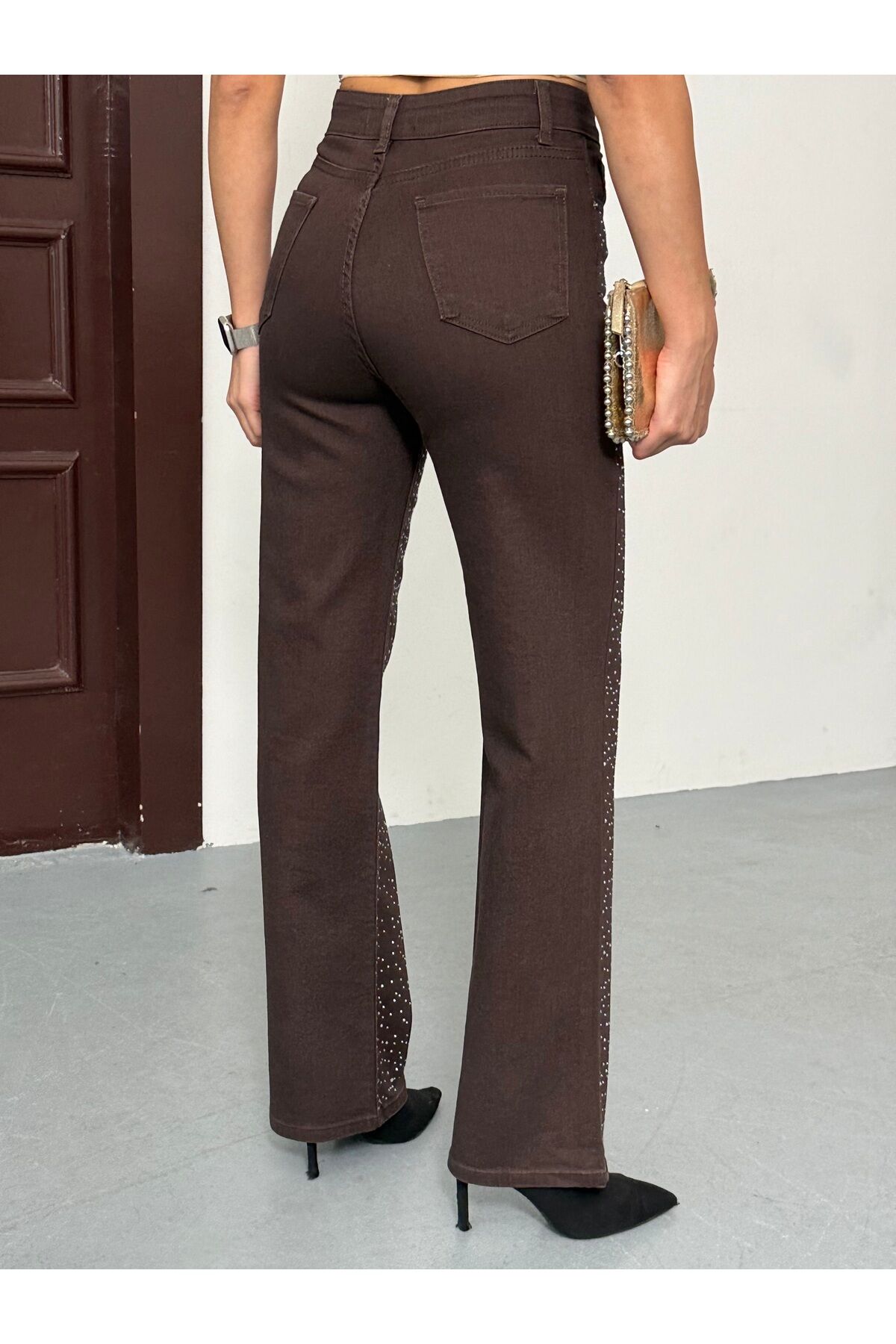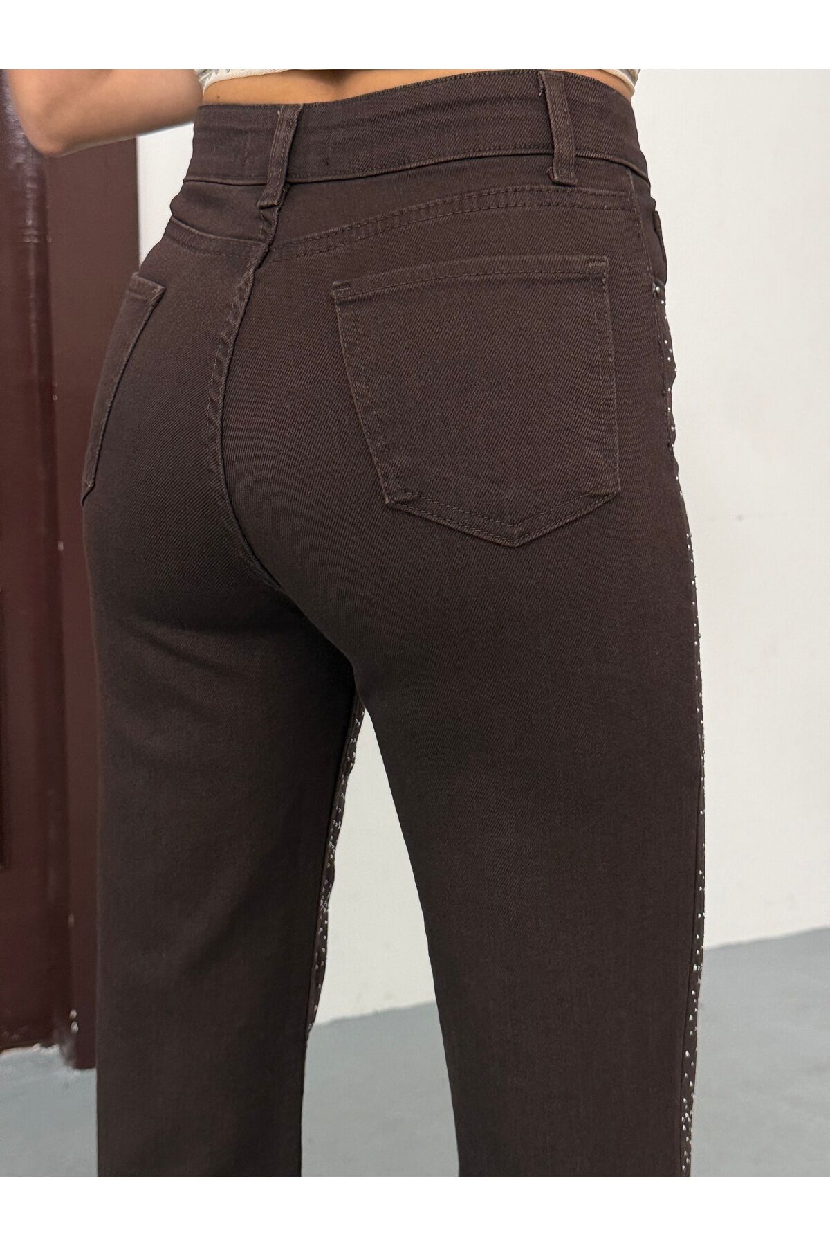 Kadın Yüksek Bel Acı Kahve Parlak Taş Desenli Özel Tasarım Likralı Palazzo Denim Jean Acı Kahverengi - 38