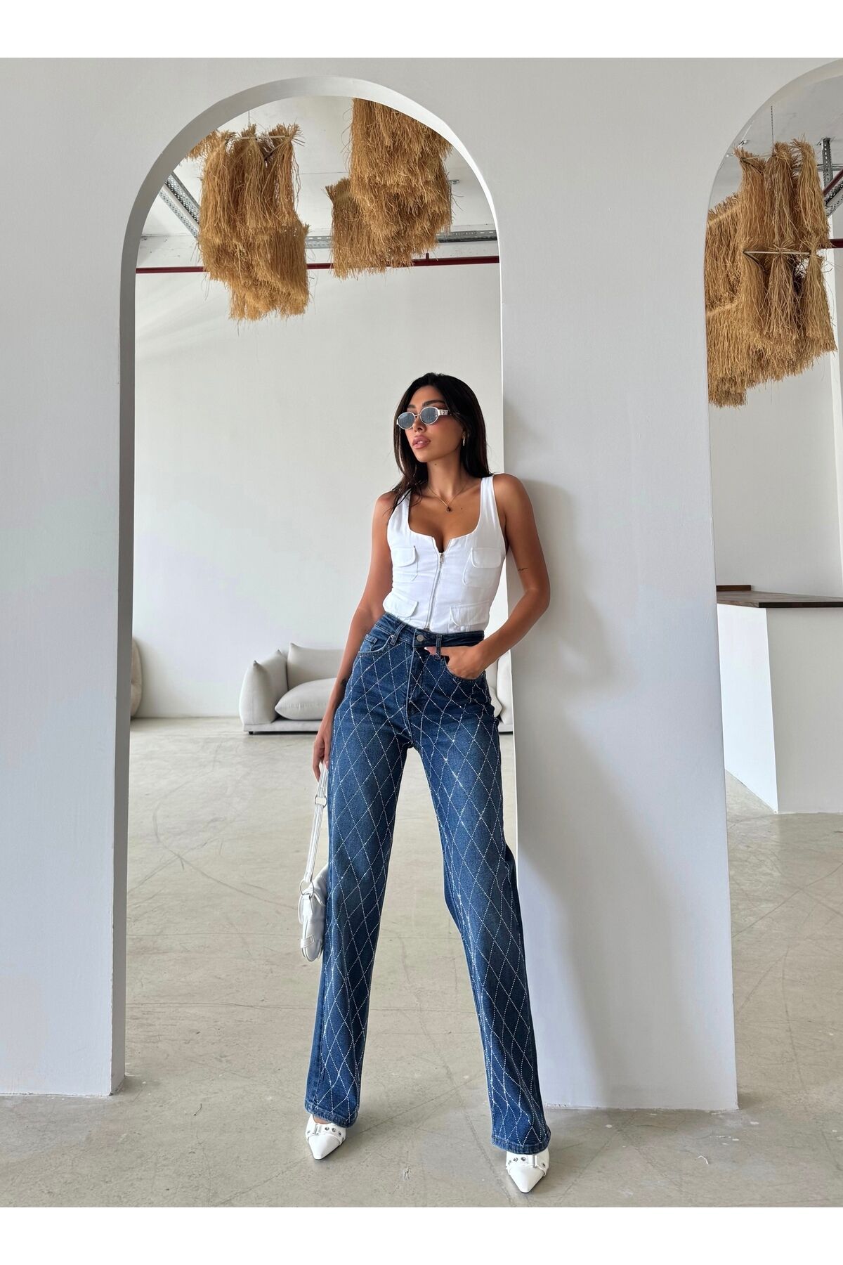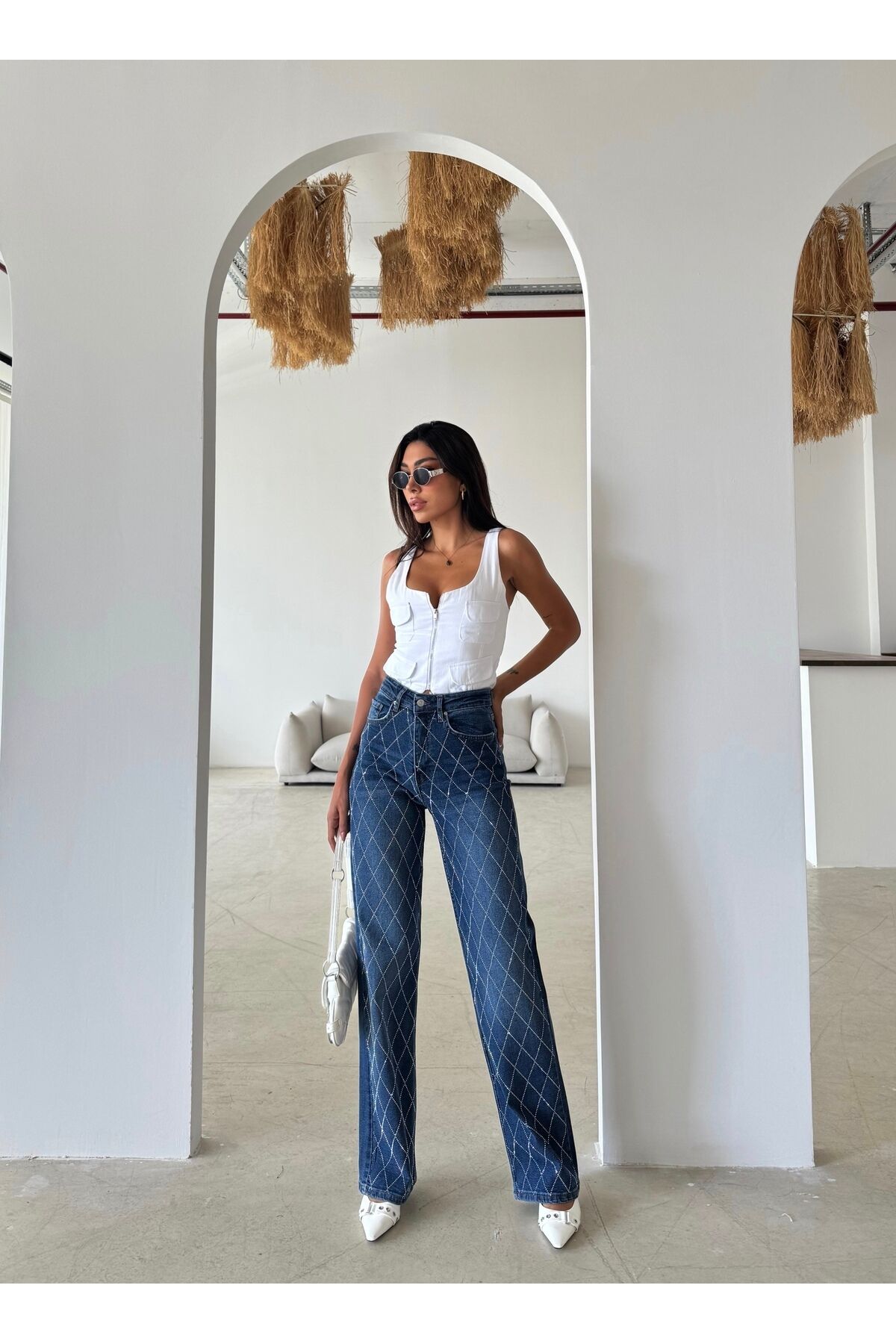 - Yüksek bel tasarımı sayesinde vücut hatlarını zarifçe sarar ve rahat bir kullanım sunar.; - Parlak taş desenli özel tasarım, günlük şıklığınıza modern bir dokunuş katar.; - Likralı denim kumaşı, esnek yapısıyla gün boyu konfor sağlar ve hareket özgürlüğü tanır.; - Palazzo kesimi geniş paça, trend bir görünüm sunarken rahatlığı ön planda tutar.; - Düğme ve fermuar kapama şekli, kolay giyilip çıkarılmasını sağlar.; - 5 cep detayı, pratik kullanım için yeterli saklama alanı sunar.; - Tüm sezonlar için uygun olan bu jean, gardırobunuzun vazgeçilmez parçası olacak.; - Kemersiz tasarımı, farklı kemerlerle kişisel tarzınızı yansıtma imkanı verir.; - Baklava deseniyle dikkat çekici bir görünüm elde edersiniz.; - Türkiye'de üretilmiş olup, yerel üretimden gurur duyar.;- Vintage parlak taş desenleriyle dikkat çeken bu palazzo denim jean, günlük kullanım için idealdir.; - Beş cepli tasarımı sayesinde pratik depolama alanları sunar ve günlük eşyalarınızı yanınızda taşımanız kolaylaşır.; - Rahat dokuma tipi ile konforlu bir deneyim sağlar; hareket özgürlüğünüzü kısıtlamaz.; - 30 derecede makinede yıkanabilme özelliğiyle bakımı kolaydır; beyazlatıcı ve kurutucu kullanımına gerek kalmadan temizlenebilir.; - Tersten ütüleme önerisiyle formunu korur ve uzun süreli kullanım için idealdir.; - Her sezon tercih edebileceğiniz bu jean, tüm mevsimlerde şıklığınızı tamamlar.; - Cool & comfort persona'ya hitap eden tasarımıyla rahatlığı ön planda tutan bir stil sunar.; - %3 elastan ve %97 pamuk materyal bileşeni esneklik kazandırırken dayanıklılığı arttırır.; - Denim koleksiyonunun vazgeçilmez parçası olan bu jean, baklava deseniyle modern bir görünüm sağlar.; - Düz kesimi sayesinde farklı üst giyim seçenekleriyle kombinleyebilirsiniz.; - Genç yaş grubuna yönelik tasarlanmış olup dinamik tarza sahip kadınların beğenisine sunulmuştur.; - Türkiye'de üretilmiş olmasıyla yerel üretim avantajlarından faydalanabilirsiniz.; - Uzun boyu ile bacak hatlarınıza zarifçe otururken geniş paça detayı modern bir siluet çizer.; - Regular kalıp ile vücut hatlarınıza uyum sağlayarak rahat bir kullanım imkanı tanır.; - Esnek yapısı sayesinde gün boyu konforlu hissetmenizi sağlar.; - Geniş paça tipiyle trendleri takip edenler için idealdir; stilinizi yansıtmanın yeni yollarını bulmanıza yardımcı olur.; - Comfort kalıbıyla günlük aktivitelerinizde size eşlik edecek mükemmel bir seçenektir.