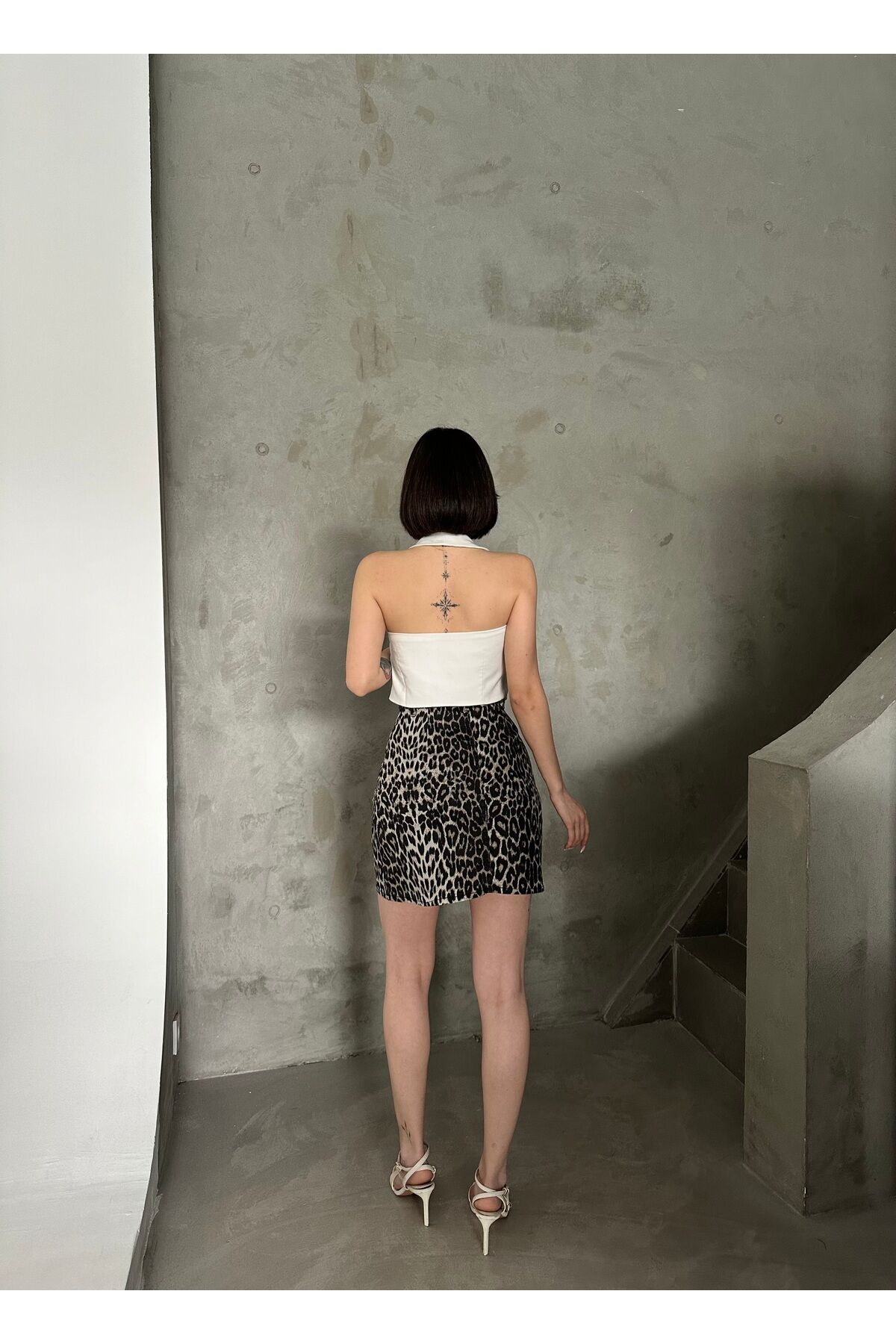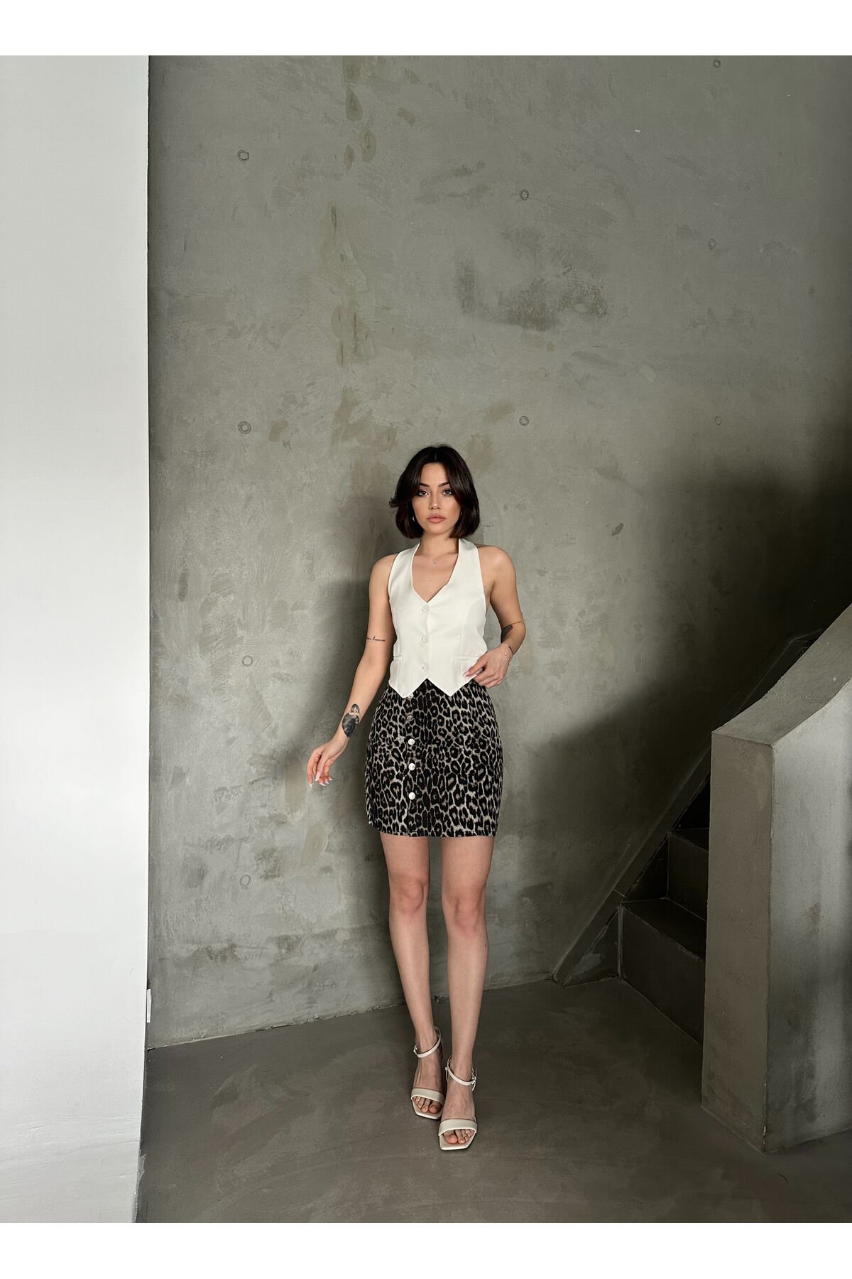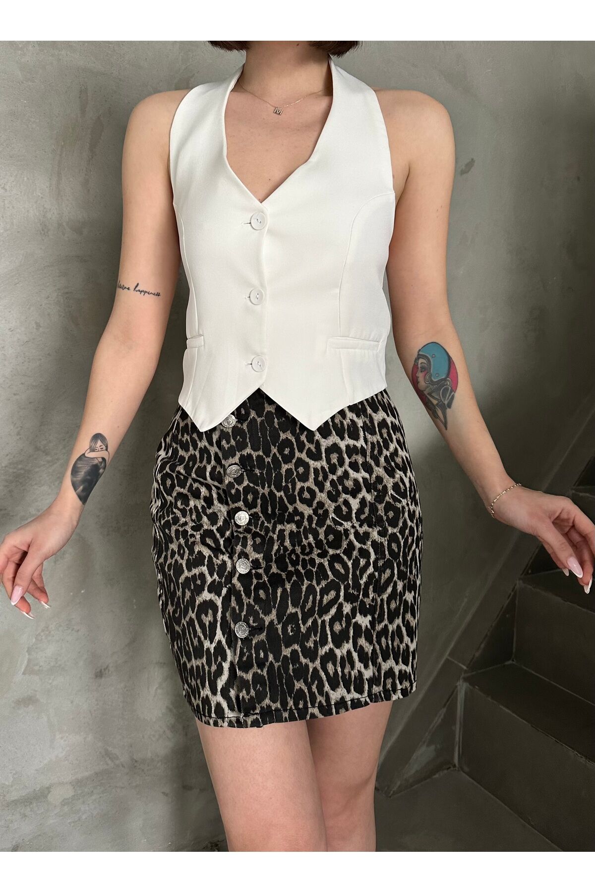 Kadın Yüksek Bel Leopar Desen Önü Düğmeli Mini Denim Etek Gri - 2XL
