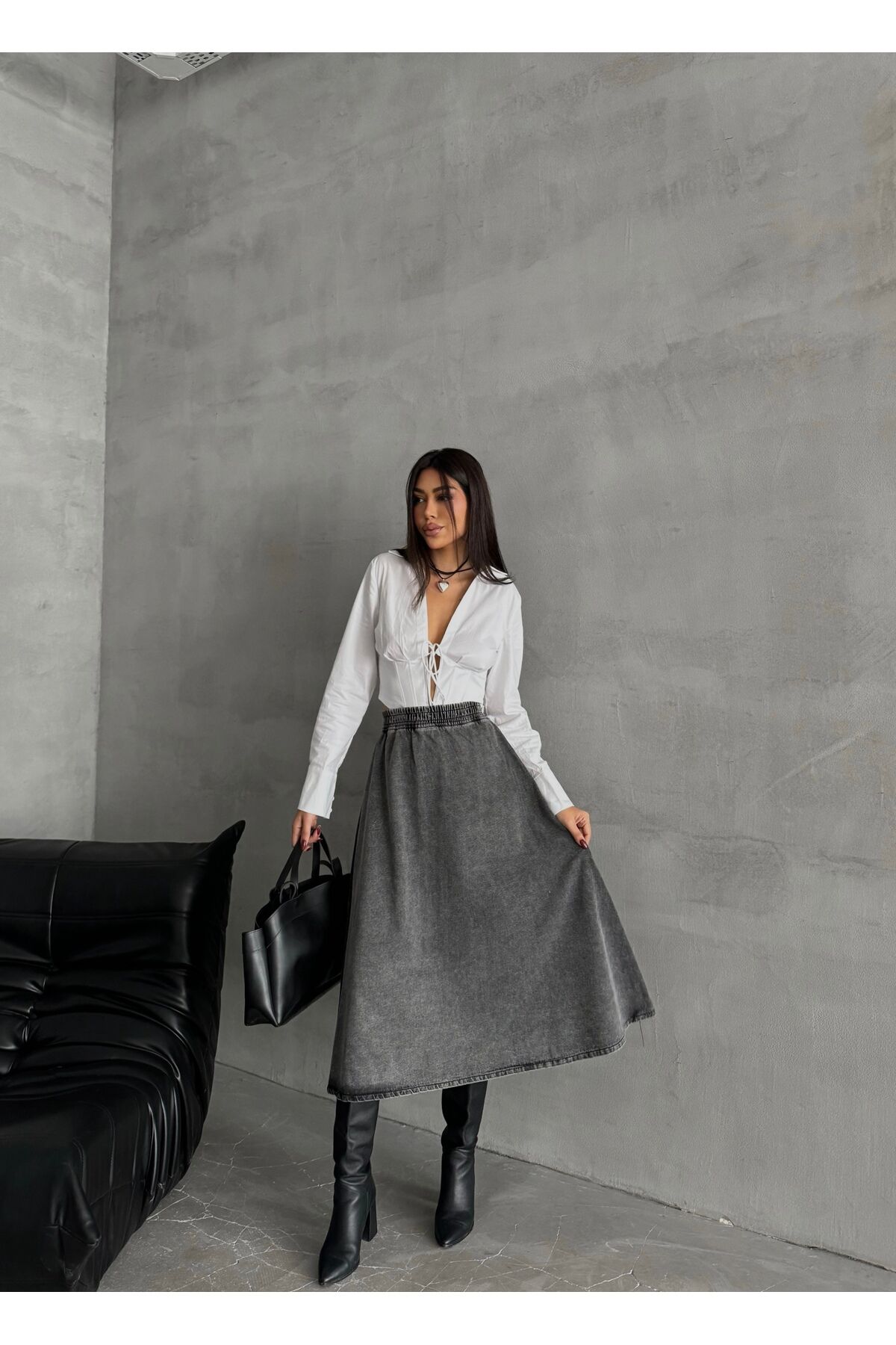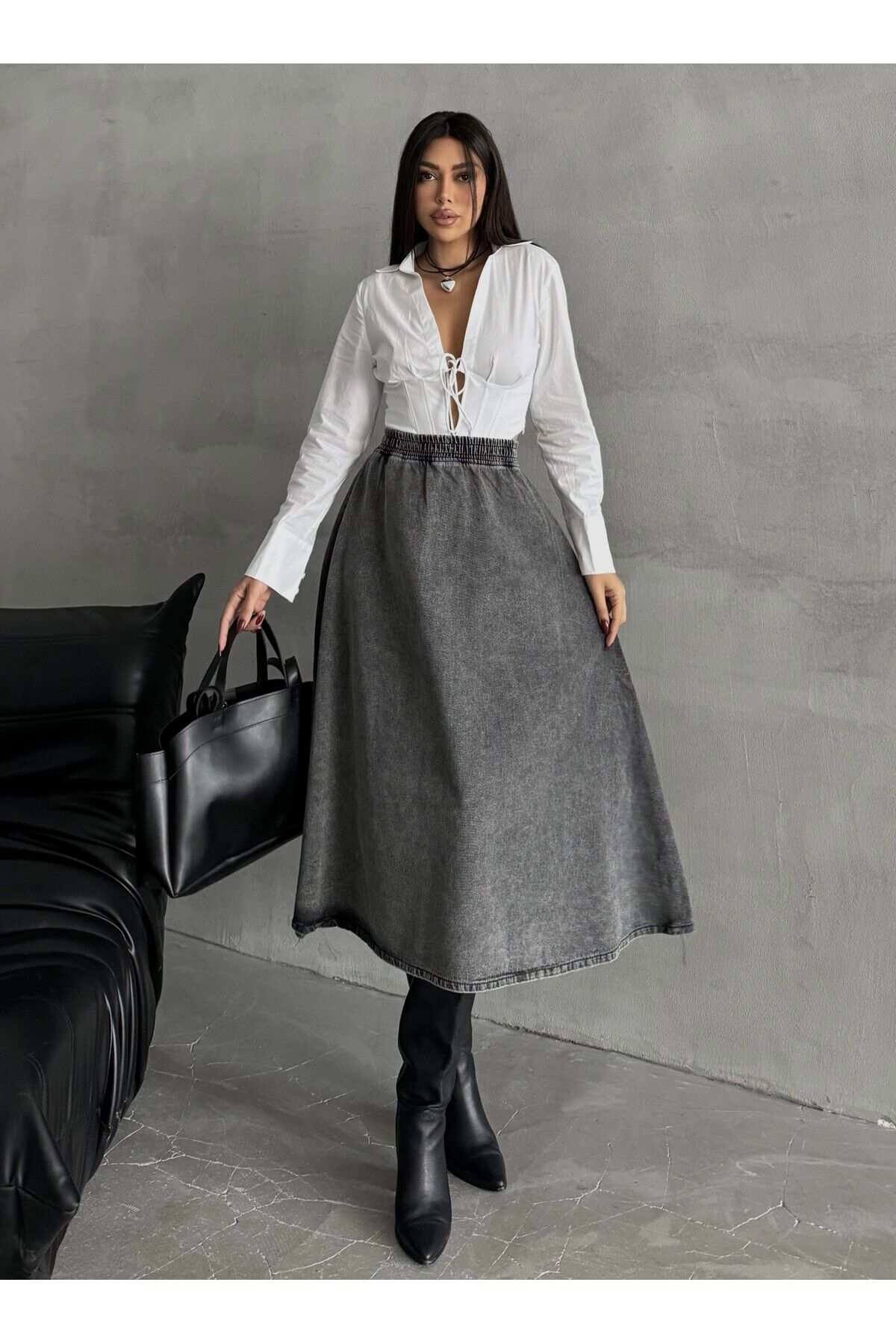 Kadın Yüksek Bel Midi Boy Beli Lastikli Kloş Denim Etek Antrasit - S