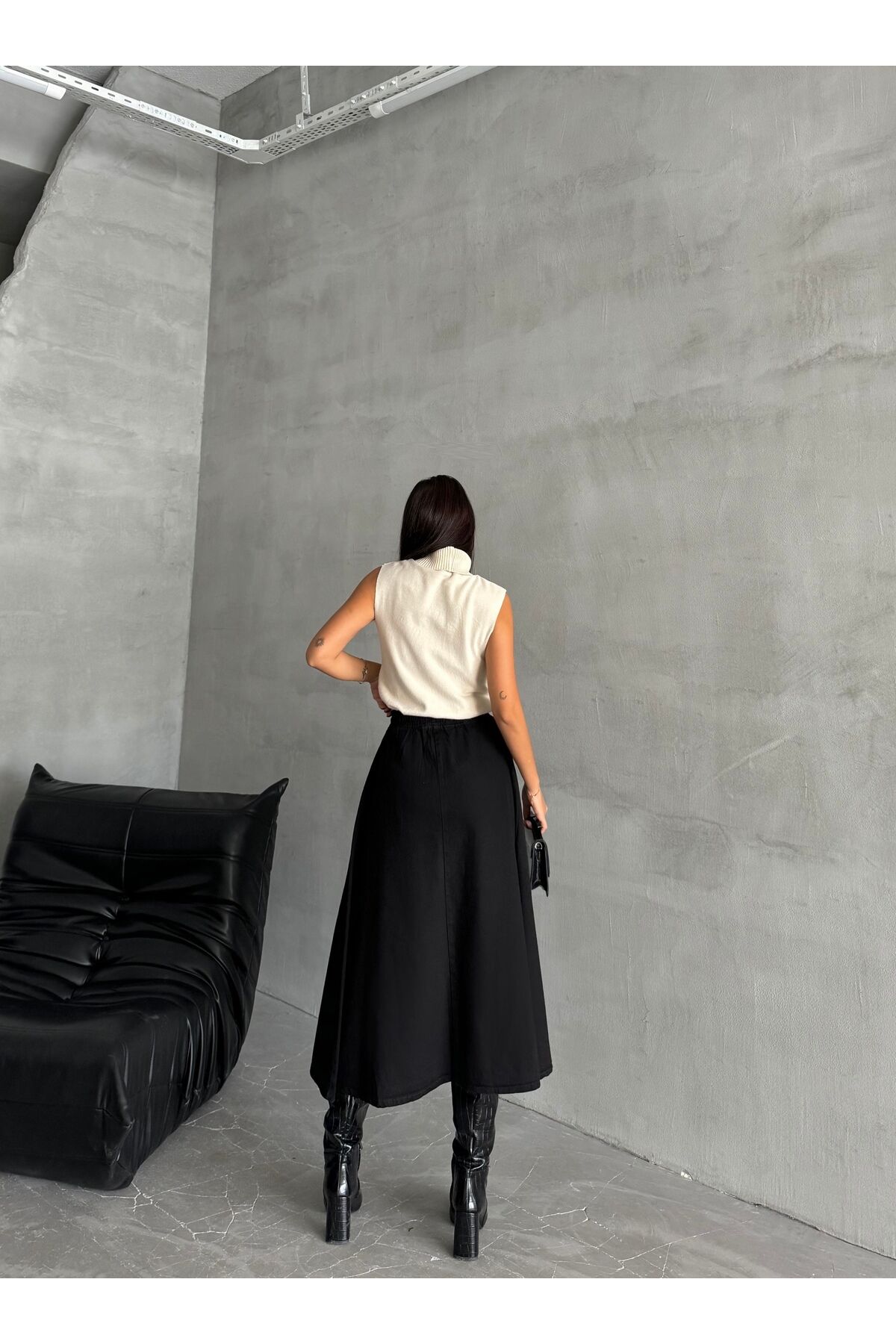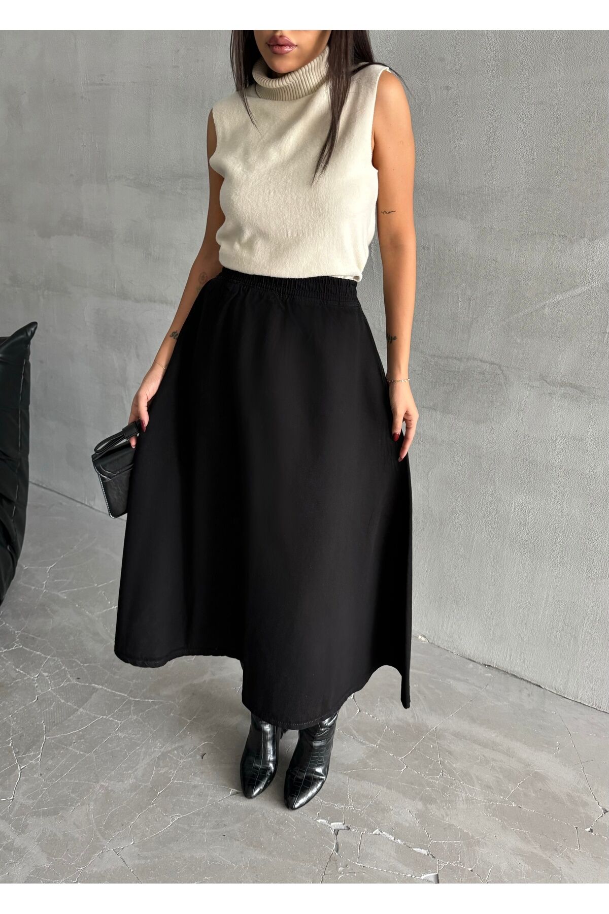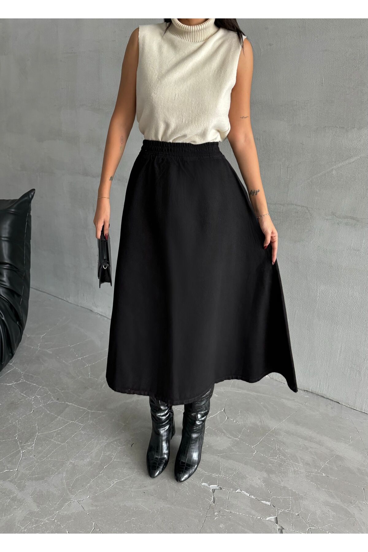 Kadın Yüksek Bel Midi Boy Beli Lastikli Kloş Denim Etek Düz Siyah - XS