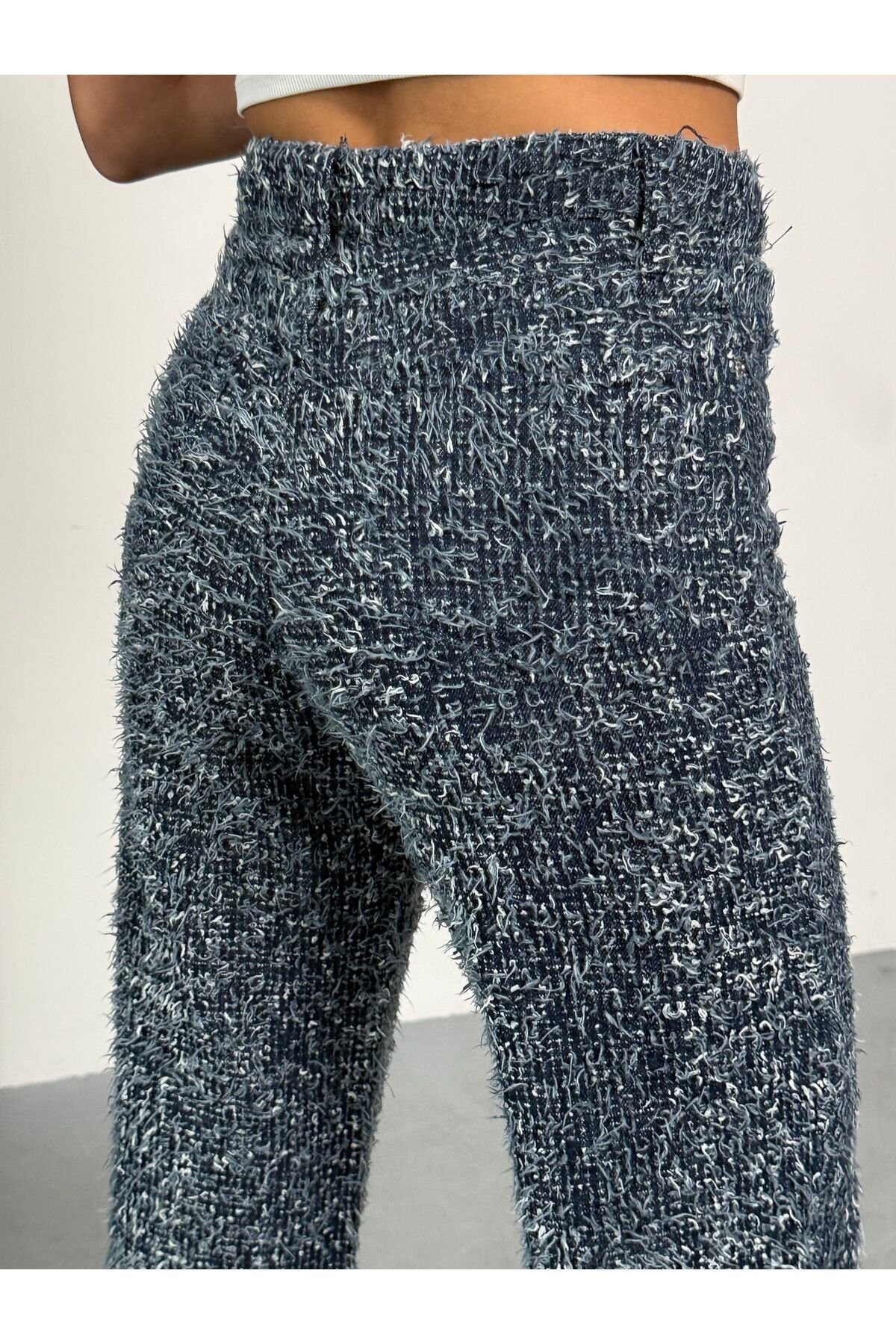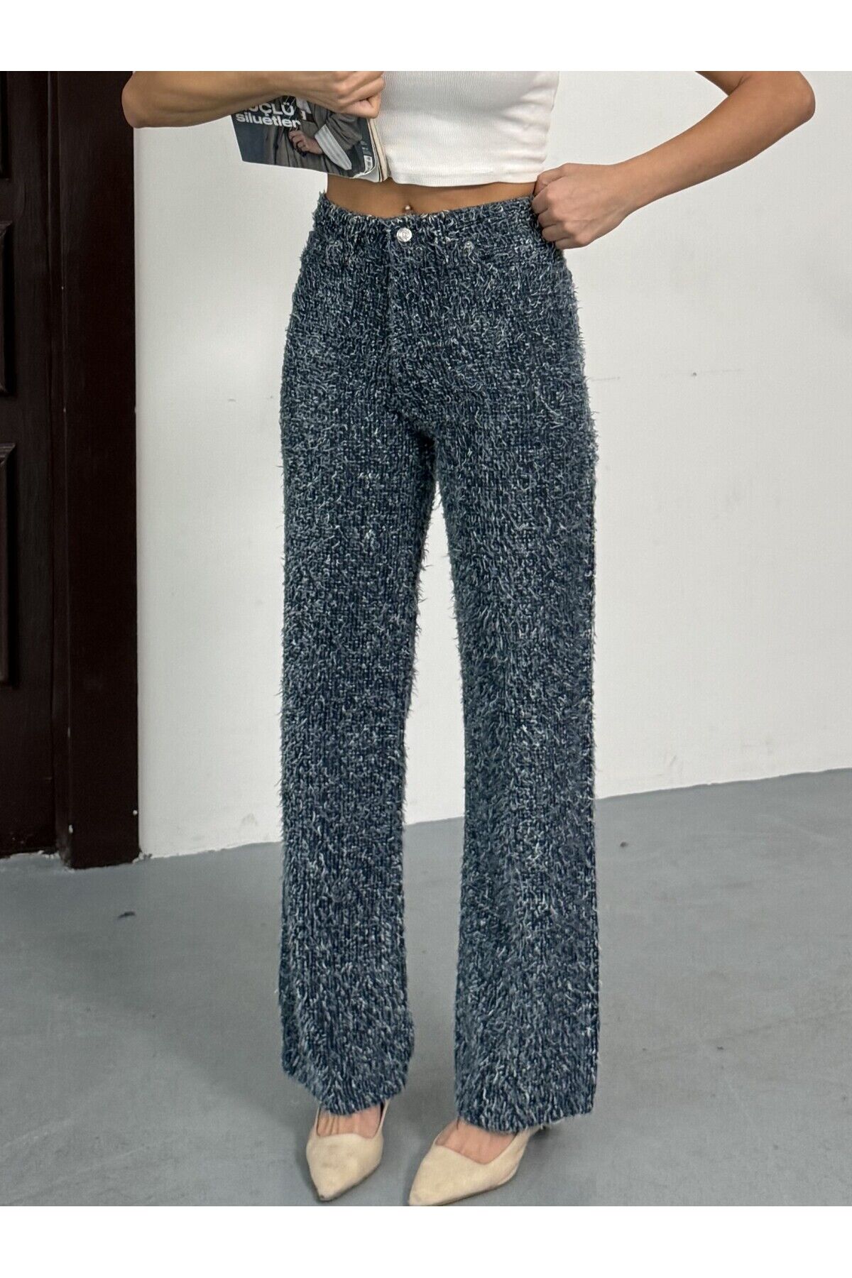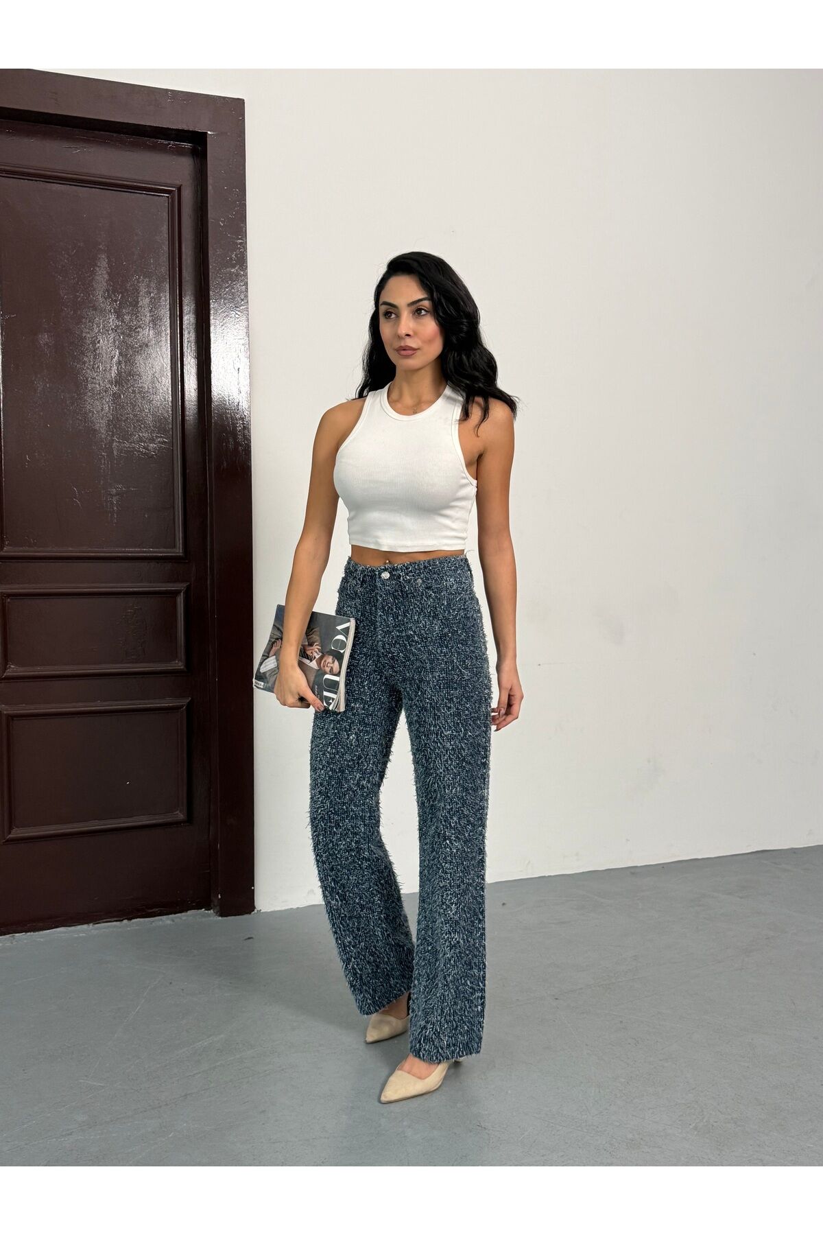 Kadın Yüksek Bel Özel Tasarım Mavi Renk Geniş Paça Pantolon İndigo - 34