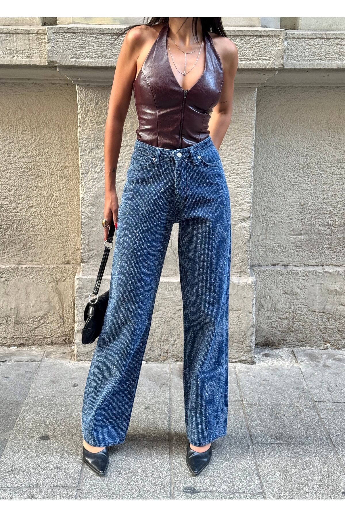Kadın Yüksek Bel Özel Tasarım Mavi Renk Geniş Paça Pantolon Koyu Mavi - 44